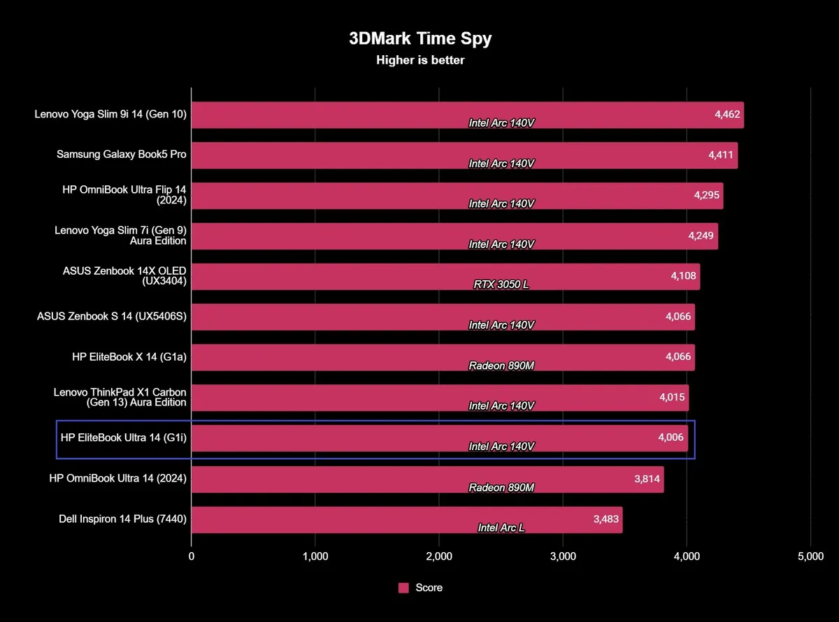 EliteBook Ultra (G1i) также является одним из самых стабильных ноутбуков с точки зрения производительности, которые я когда-либо тестировал. Разница в производительности процессора при подключении и отключении зарядного устройства была нулевой, а производительность графического процессора снизилась всего на 4%.