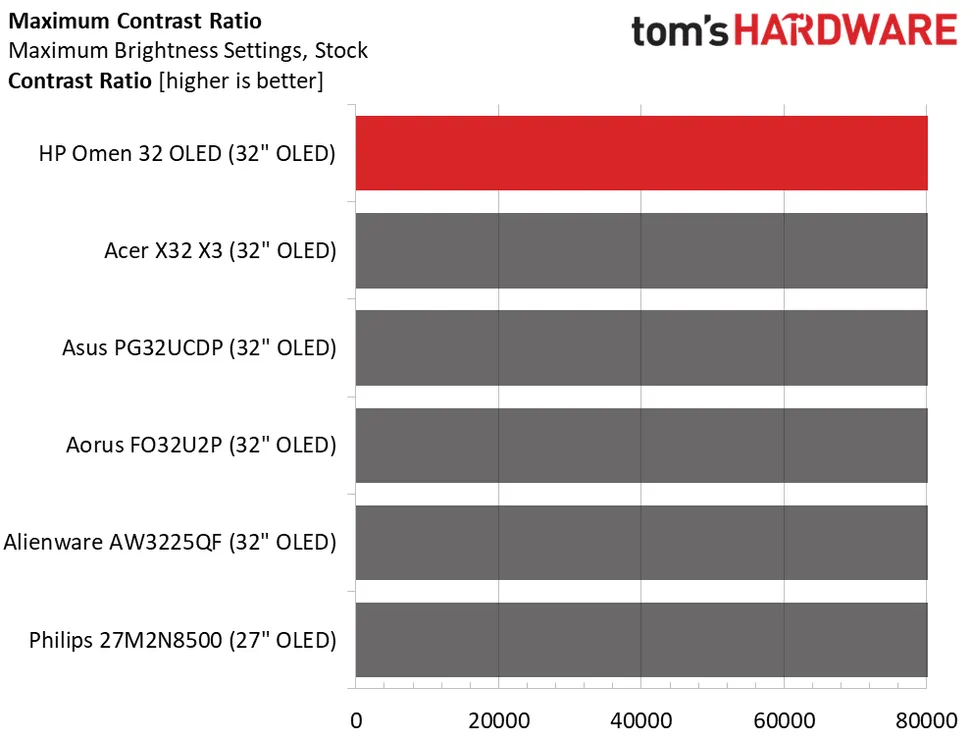 Вывод по результатам тестирования: в Omen 32 OLED отсутствует функция регулировки яркости для SDR-контента. Это незначительное упущение, поскольку экран и так достаточно яркий для использования в помещении. Он отлично подходит для SDR-игр и ещё лучше — в режиме HDR, где яркость может достигать 1000 нит.