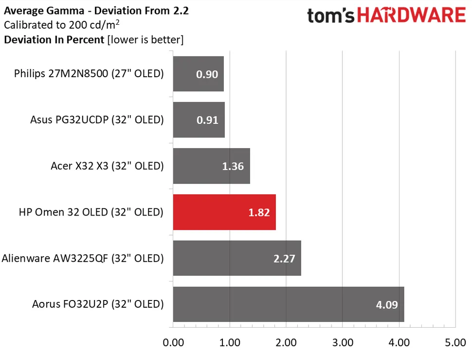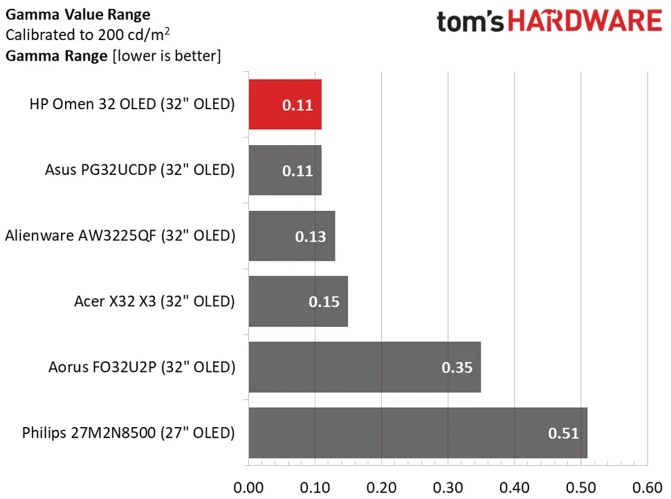 При сравнении гаммы у Omen 32 OLED самый узкий диапазон значений — от 0,11 до 0,11. Среднее значение отличается от 2,2 на 1,82%,что соответствует фактическому значению 2,24. Хотя в экранном меню нет настроек гаммы, вы можете использовать Display Center, чтобы улучшить этот показатель.