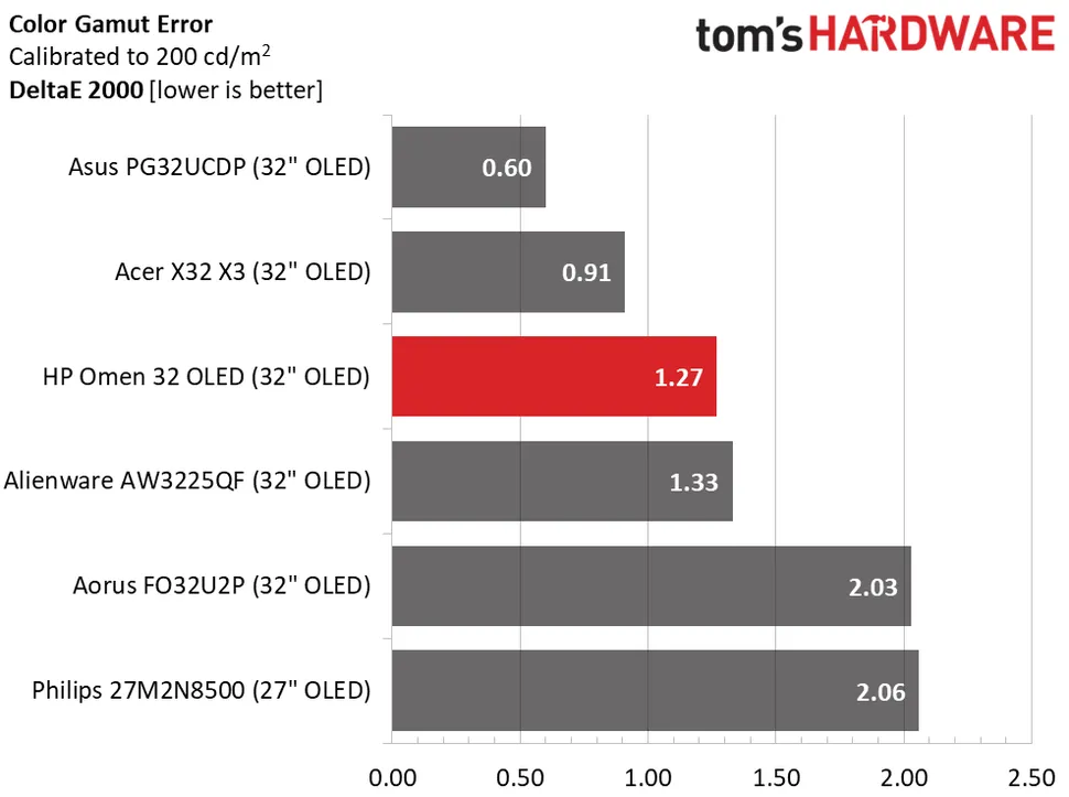 Любой OLED-монитор отличается превосходной точностью цветопередачи, и Omen 32 OLED не является исключением. Его итоговый показатель в 1,27 dE для DCI-P3 чрезвычайно низок. Видимых проблем нет.