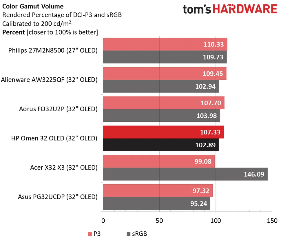 В тесте на громкость Omen 32 OLED немного отстаёт от топовых экранов, но опережает мониторы без QD. Основное преимущество заключается в хорошо различимых красных и зелёных оттенках, поэтому он всё равно выглядит более ярким, чем мониторы Acer и Asus. Его охват sRGB составляет 102 %, что является идеальным показателем. Это отличная производительность.