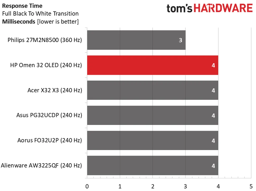 Omen 32 OLED — лучший из остальных. Он опережает Acer на 1 мс и является самым быстрым 4K OLED-дисплеем, который я когда-либо видел. С точки зрения визуального восприятия я не могу сказать, чем HP отличается от занявшего последнее место Aorus. Но профессиональным геймерам, которые стремятся получить все возможные преимущества, стоит задуматься о приобретении Omen 32 OLED. Он действительно быстрый.