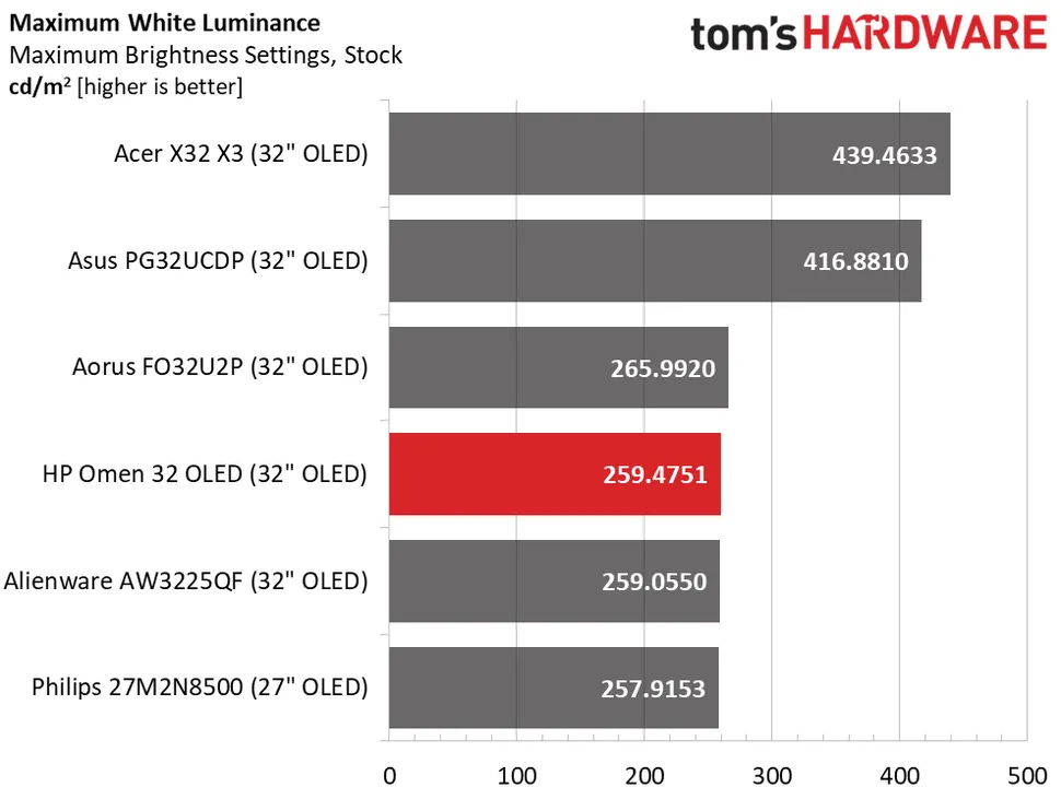 HP Omen 32 OLED 4K: неоткалиброванный — максимальный уровень подсветки