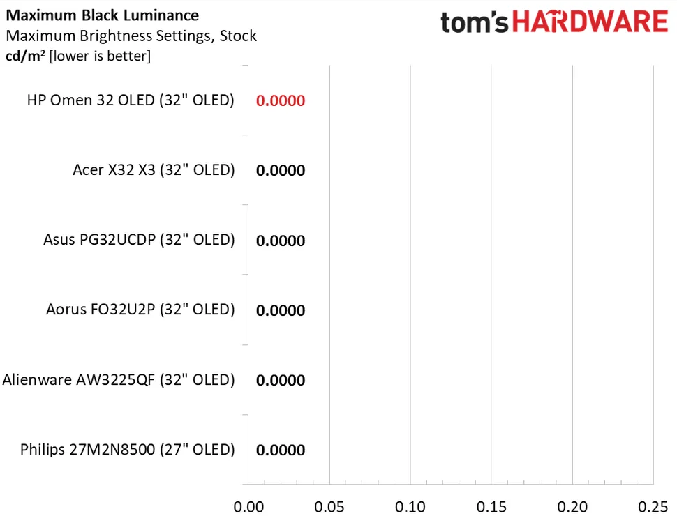 При тестировании HDR-мониторов я измеряю 25 % оконных паттернов, чтобы обеспечить равные условия. Максимальная яркость Omen 32 OLED составляет 432 нита, что немного ниже, чем у других моделей, но значительно превышает требования сертификации DisplayHDR 400. При установке точки отсечения на уровне 1000 нит получаются самые яркие блики и наиболее эффектное HDR-изображение. Asus выделяется тем, что его панель работает немного интенсивнее, чем у других. Уровень чёрного и контрастность измерить невозможно.
