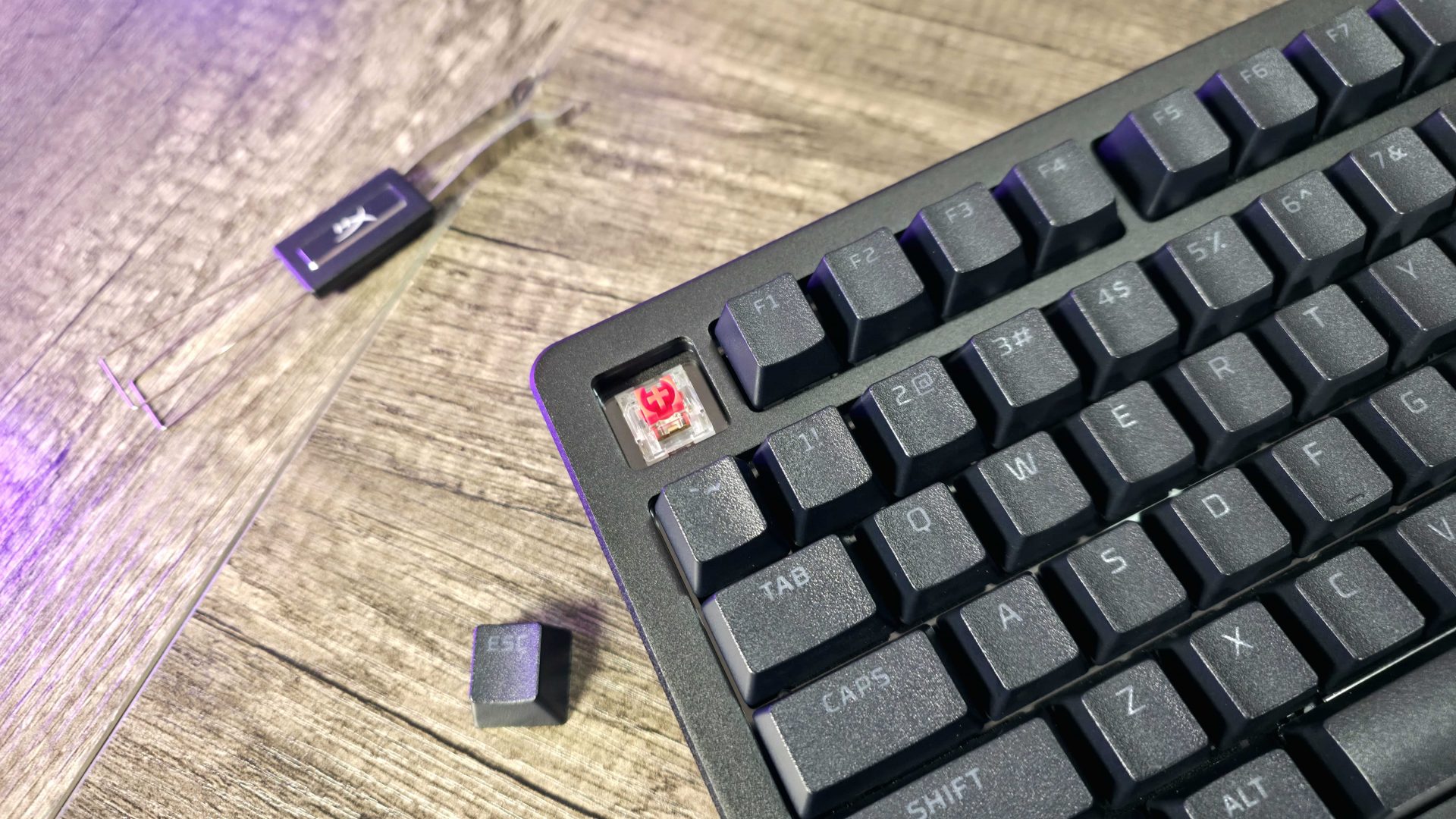 Если не брать в расчет компоновку, то это конструкция с уплотнительными прокладками, выполненная в основном из пластика, с алюминиевой верхней рамой, которая фактически соединена магнитами. Ее можно снять, чтобы открыть доступ к винтам, скрепляющим клавиатуру, и заменить на раму другого цвета. Также с правой стороны клавиатуры есть небольшой металлический значок, который можно заменить на различные варианты дизайна; HyperX продает наборы значков за $24,99 (≈2,0 тыс. руб.) на HyperX.com.