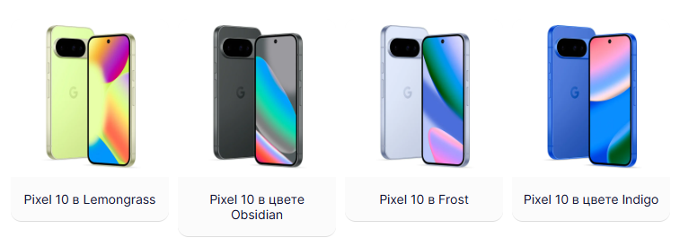 Цвета Pixel 10 включают в себя «Обсидиан», «Индиго», «Морозный» и «Лимонно-зелёный», а цвета iPhone 17 — «Чёрный», «Лавандовый», «Туманный синий», «Мудрый» и «Белый».