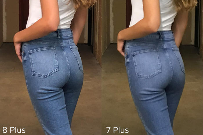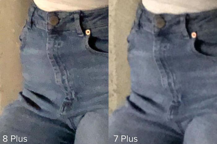Но рассматривая увеличенные фрагменты, на снимке с 8 Plus мы видим гораздо больше деталей на джинсах модели