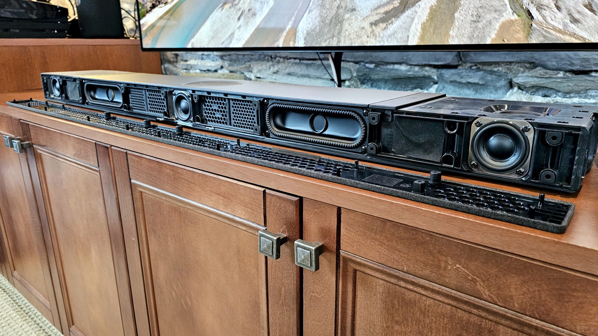 Хотя он, возможно, не кричит «KEF», это разумный выбор. Саундбары обычно находятся в поле вашего зрения при просмотре телевизора, поэтому чем меньше визуальных отвлекающих факторов, тем лучше. Klipsch сделали ставку на яркость с динамиками в своей серии саундбаров Cinema, и мой взгляд постоянно притягивался к их металлическому блеску. Хотите увидеть драйверы XIO? Снимите грили, и вуаля.