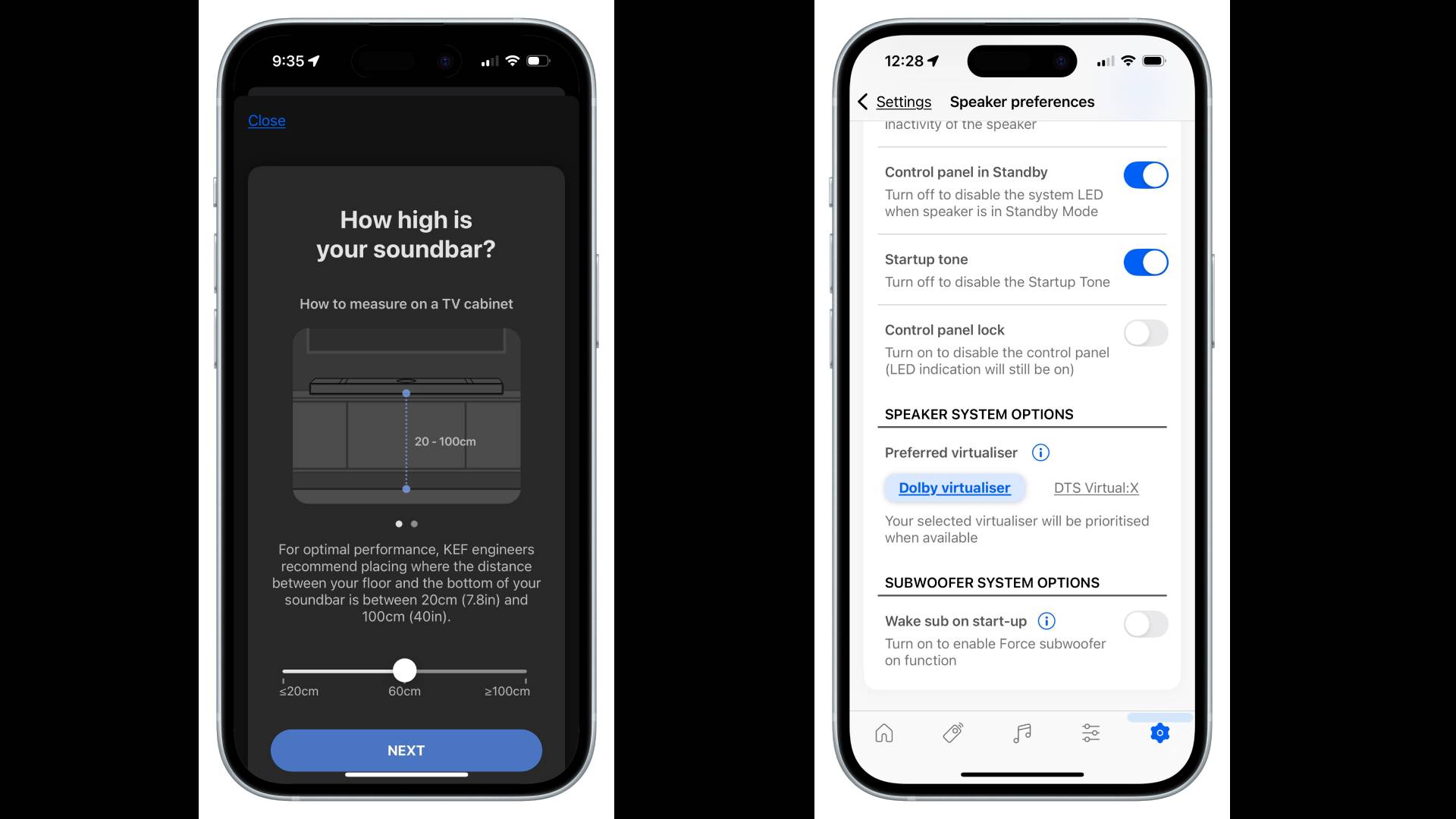 Используя приложение KEF Connect, вы можете запустить функцию коррекции помещения XIO. Я бы охарактеризовал ее как полуавтоматическую: вам все еще нужно указать приложению, как высоко установлен динамик и каков размер вашей комнаты, но после этого оно делает все остальное.