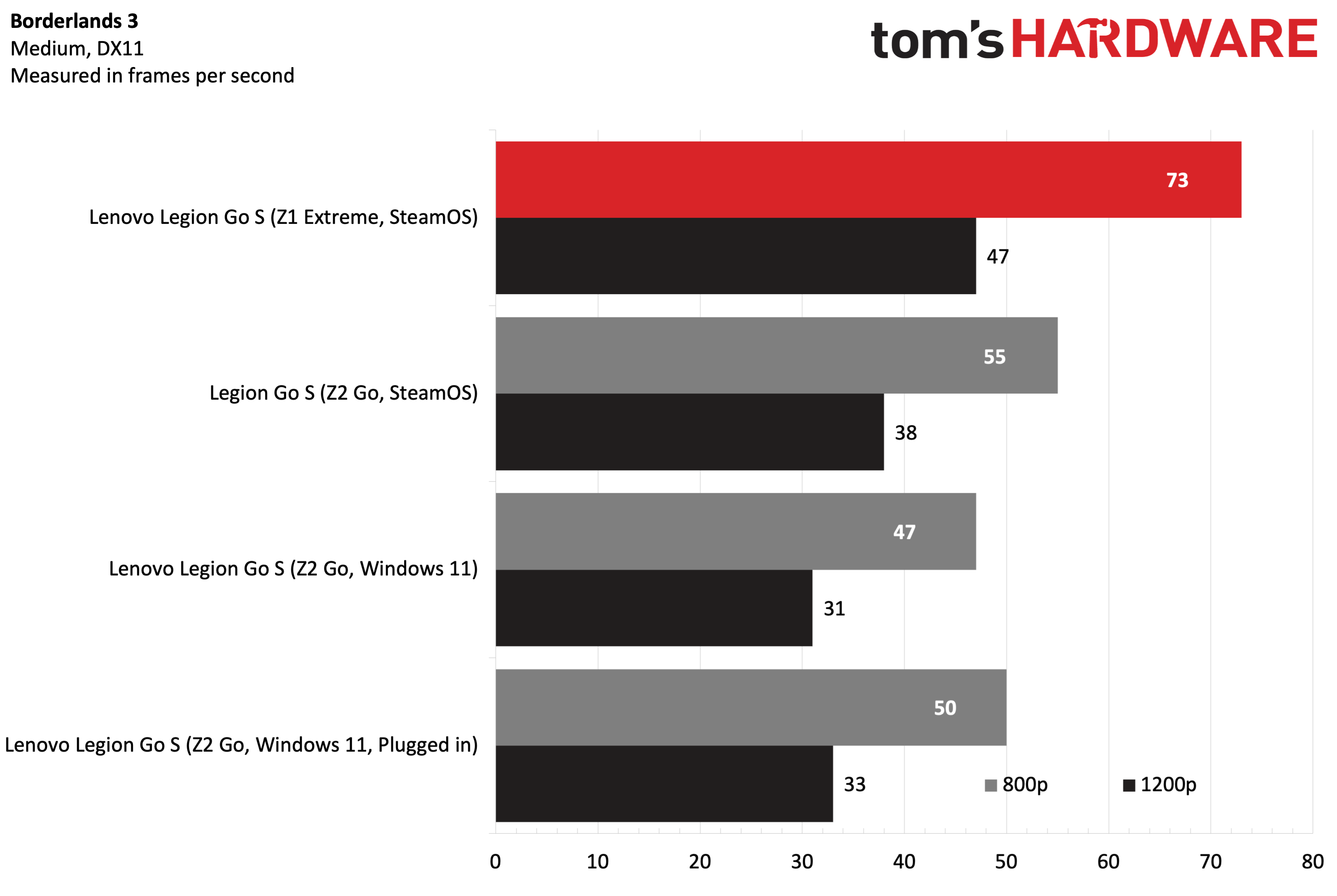 Однако самая значительная разница в производительности наблюдалась в Borderlands 3 (средние настройки). Legion Go S с Z1 Extreme сохранил преимущество в 18 кадров в секунду над соперником, занявшим второе место, при разрешении 800p.