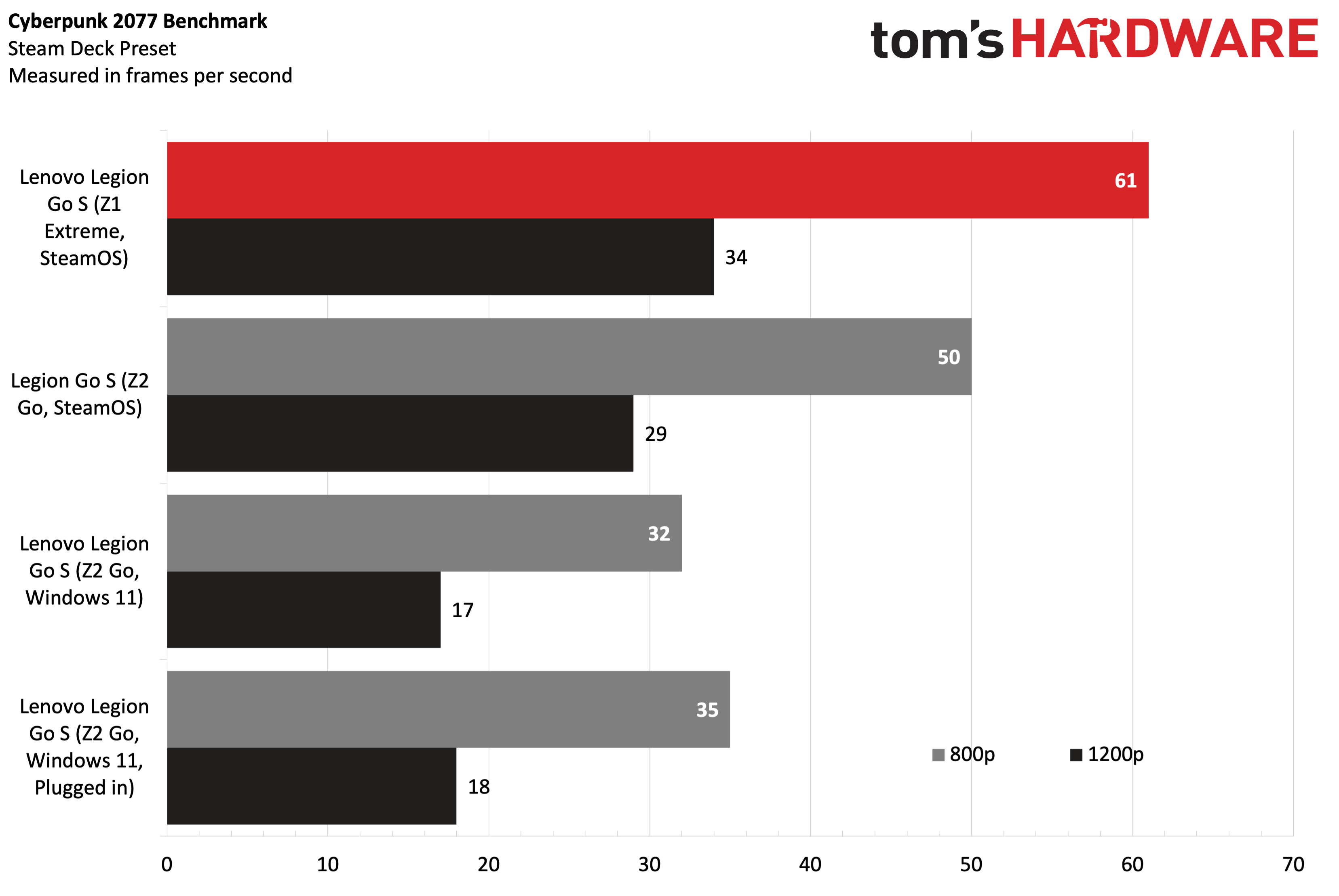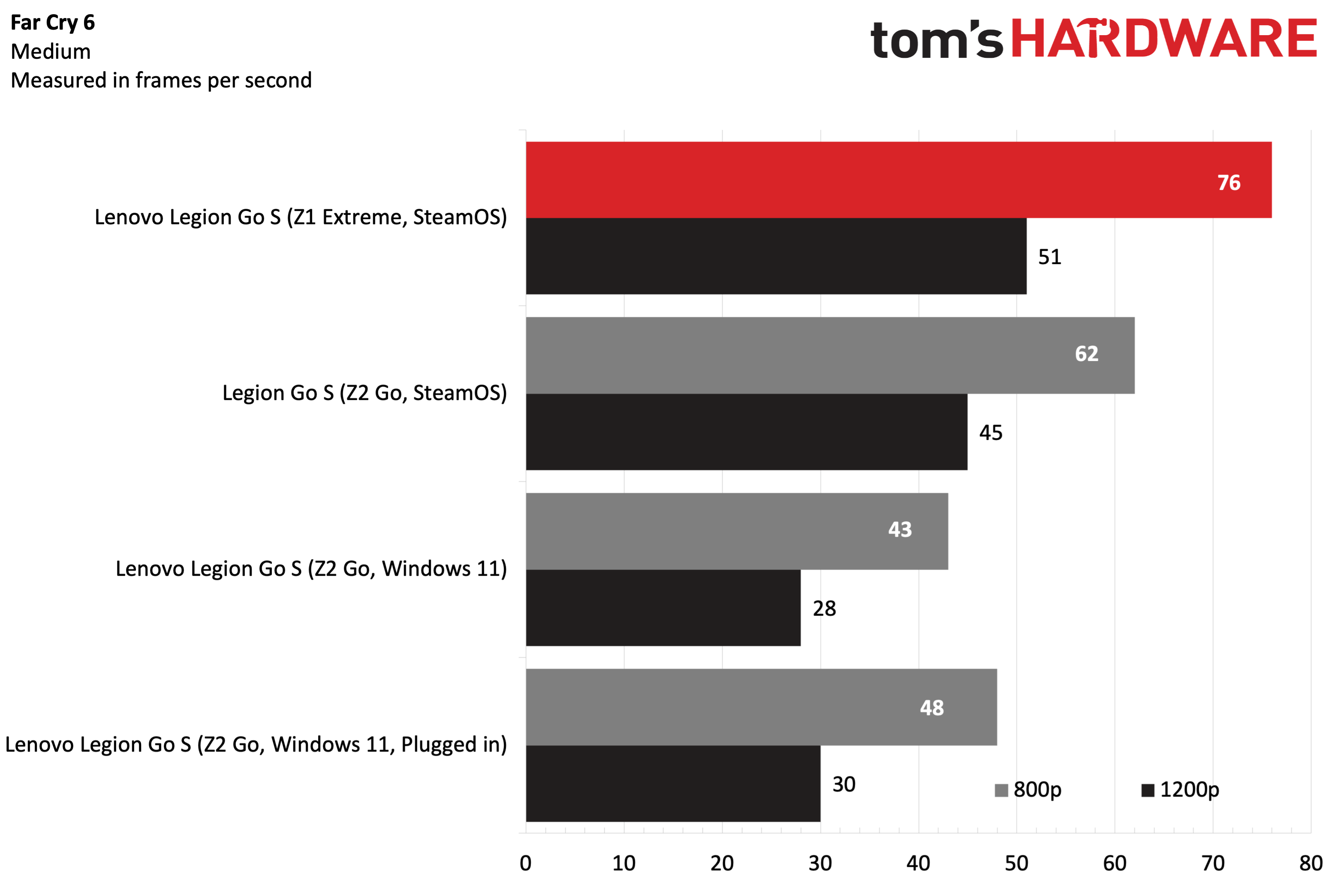 Версия системы на SteamOS стабильно превосходила аналог на Windows 11, и большую часть времени разница была существенной. Разрыв составлял от 4 до 15 кадров в секунду, в зависимости от разрешения. Преимущество в производительности ещё более заметно, поскольку Legion Go S на базе SteamOS достигал одинаковой производительности как при работе от аккумулятора, так и от сети, и всё же превзошёл версию на Windows 11, которая работала в режиме максимального энергопотребления (40 Вт при питании от сети).