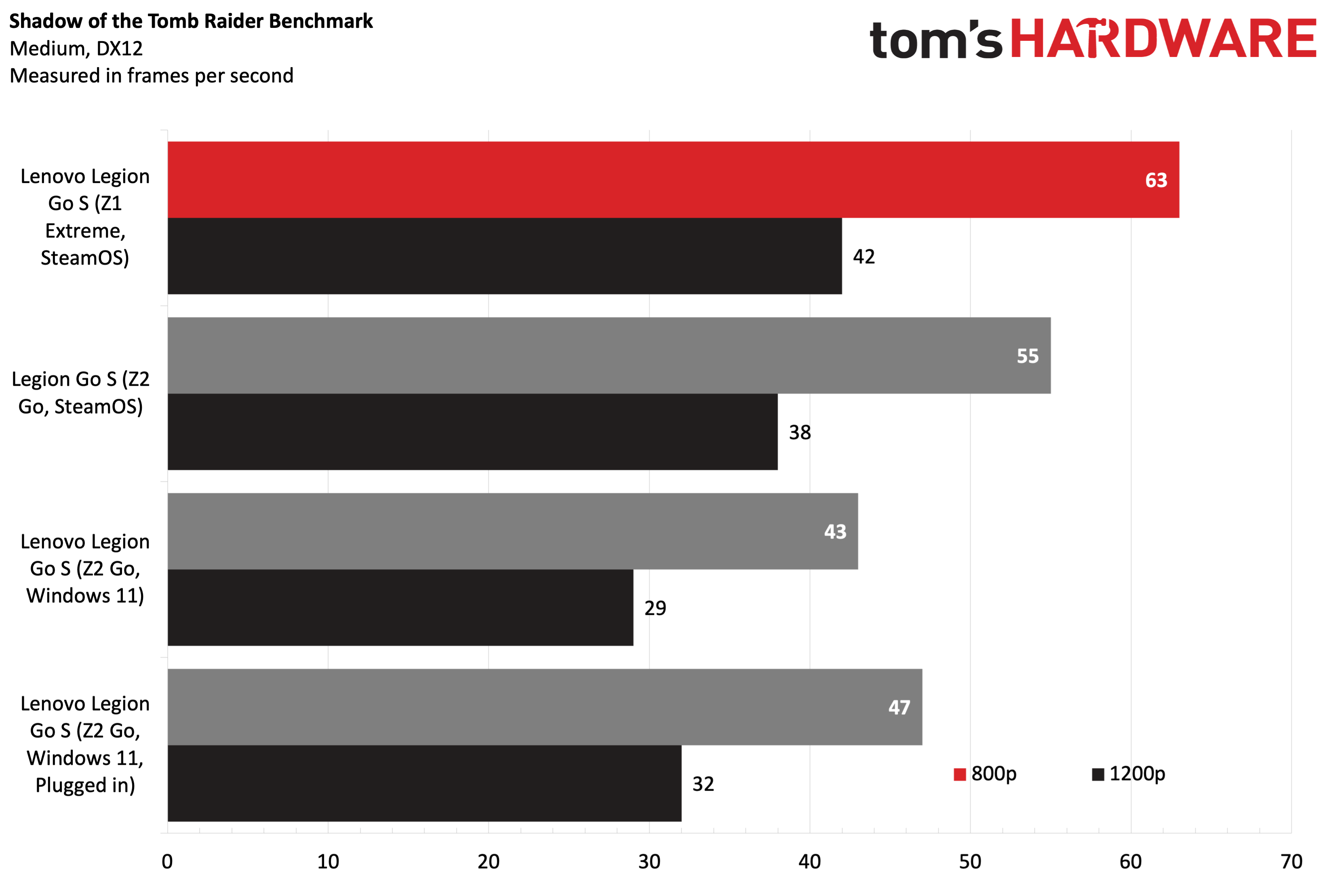 В бенчмарке Shadow of the Tomb Raider (средние настройки) Legion Go S (Ryzen Z1 Extreme, SteamOS) показал значительное преимущество в 8 кадров в секунду (fps) при разрешении 800p над менее производительным Legion Go S (Ryzen Z2 Go, SteamOS). При разрешении 1200p преимущество сократилось до 4 кадров в секунду.