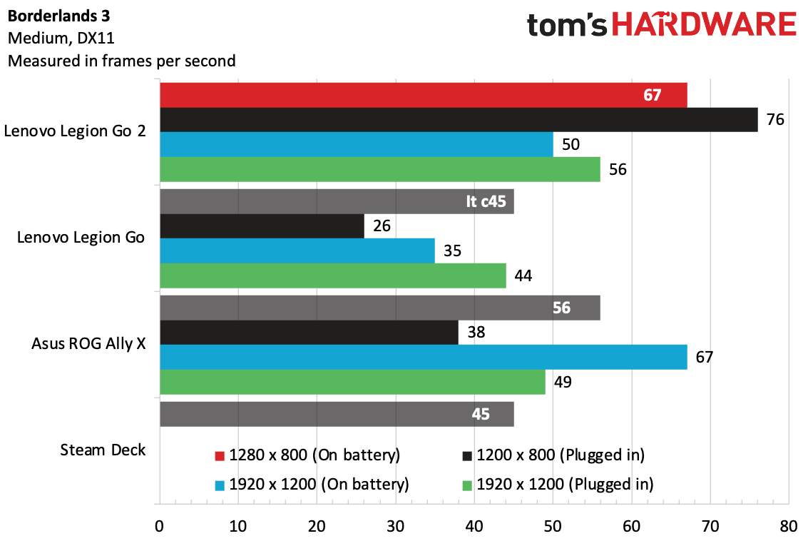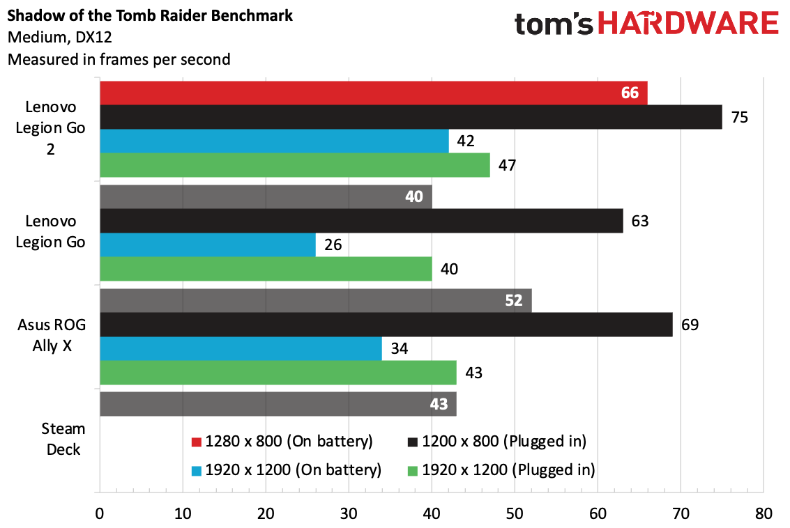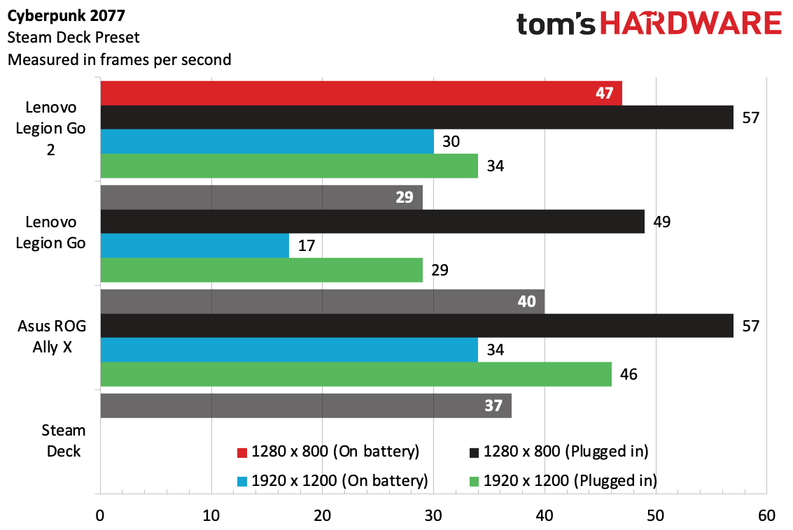 В Cyberpunk 2077 (пресет Steam Deck) Legion Go 2 показал 47 fps (от батареи) и 57 fps (от сети) при 800p. Однако при 1200p он уступил ROG Ally X.