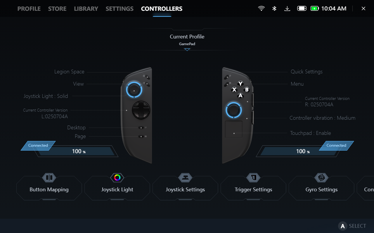 На левом контроллере кнопки для Legion Space, просмотра (View), Alt-Tab и рабочего стола Windows. На правом — кнопка быстрых настроек (очень полезная) и меню Xbox. Мне не хватало обычной кнопки Xbox для вызова Game Bar (хотя есть сочетание клавиш). На правом контроллере есть тачпад, а на левом его нет — я бы предпочел вариант Steam Deck с двумя тачпадами.