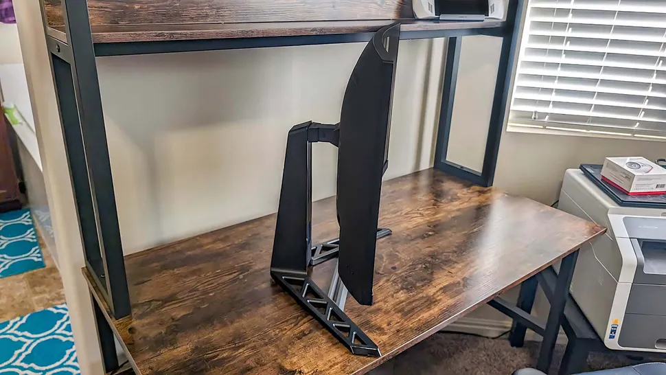 Подставка сама по себе просто фантастическая, она позволяет мне установить монитор под нужным углом. Я могу поднять монитор на 15 сантиметров над столом или опустить его так, чтобы он находился чуть выше ножек подставки. Кроме того, монитор можно наклонять вперед и назад, поворачивать из стороны в сторону и наклонять по оси. Однако, поскольку монитор относительно широкий, его нельзя полностью повернуть в портретную ориентацию, если он установлен на этой подставке.