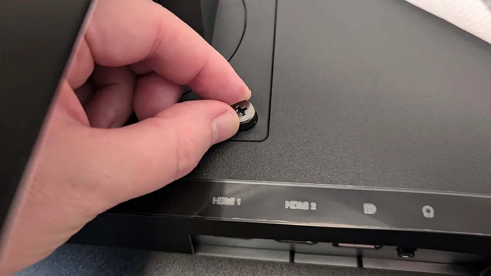 В подставке есть встроенный винт для соединения основания и подставки. Однако при подключении подставки к задней панели монитора мне пришлось вкрутить четыре винта. У этих винтов широкие грани с выступами, поэтому их легко вкрутить вручную, но для большей уверенности можно подкрутить их отвёрткой.