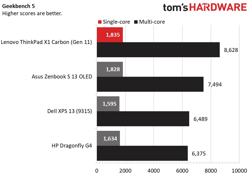 X1 Carbon занял первое место в Geekbench 5, кроссплатформенном тесте, ориентированном на процессоры. Он незначительно опередил Asus в одноядерном тесте (1835 баллов против 1828) и значительно — в многоядерном (8628 баллов против 7494). HP оказался значительно отстающим от ожидаемых результатов, учитывая его теоретически более мощный процессор.