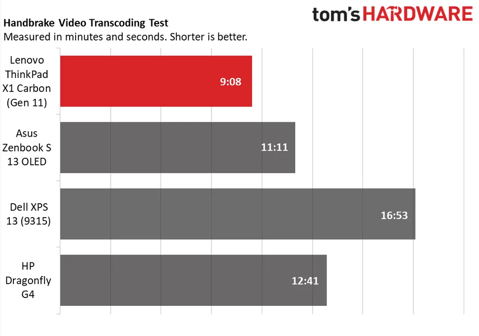 X1 Carbon также показал лучшие результаты в тесте на транскодирование видео в Handbrake: 9 минут 8 секунд против 11 минут 11 секунд у следующего по скорости Asus. В этом тесте HP снова значительно отстала от X1 Carbon.