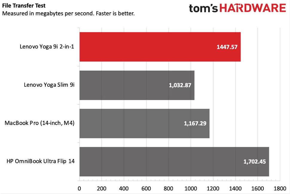 В нашем тесте на передачу файлов Yoga 9i скопировал 25 ГБ файлов со скоростью 1447,57 МБ/с, опередив Yoga Slim и MacBook Pro. Только OmniBook Ultra Flip оказался быстрее — 1702,45 МБ/с.