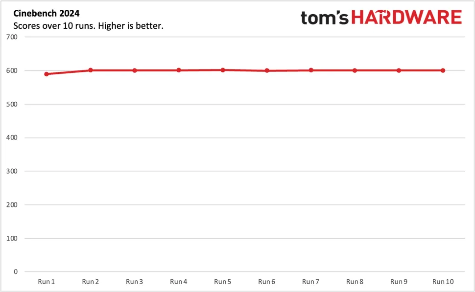 Чтобы провести стресс-тест ноутбуков, мы десять раз запустили Cinebench 2024, используя ресурсоёмкий тест рендеринга, чтобы выжать из систем максимум. Yoga 9i набрал в среднем 599,63 балла, начав медленно, но достигнув пика в 601,51 балла и сохранив его.