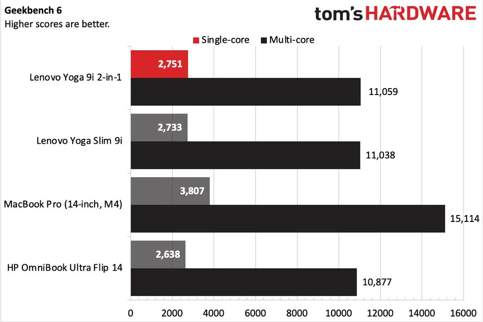 Но процессор M4 от Apple в MacBook Pro превзошёл Yoga 9i, набрав 3807 баллов в одноядерном тесте и 15 114 баллов в многоядерном.