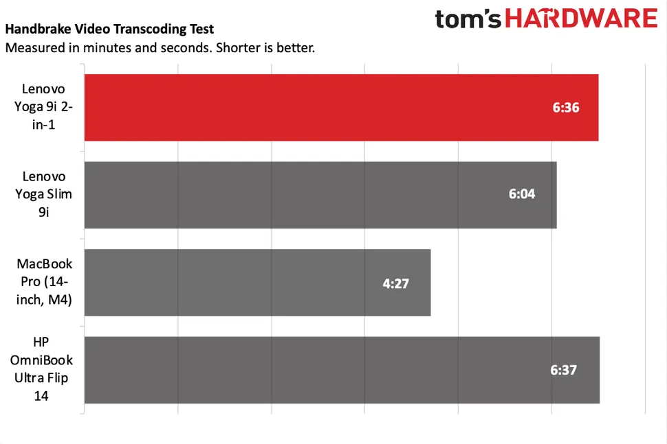 Трансформер Yoga потерял своё преимущество в Handbrake, конвертируя видео 4K в 1080p за 6 минут 36 секунд, как и OmniBook. Но MacBook Pro справился гораздо быстрее — за 4:27.