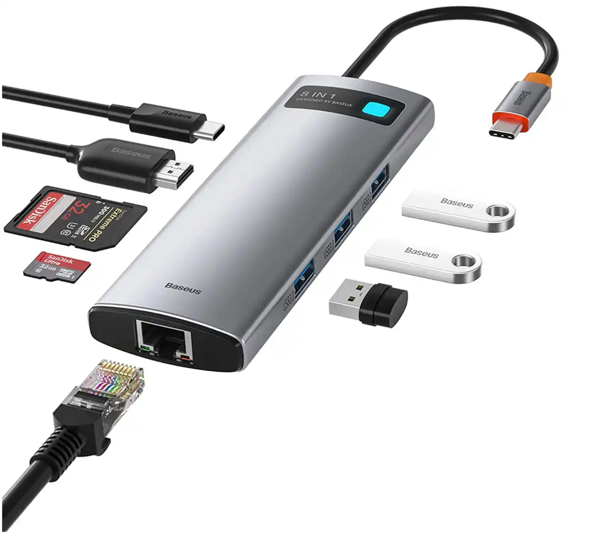 Концентратор Baseus 8-в-1 с разъемом USB-C: сквозная зарядка мощностью 100 Вт; 1 разъем HDMI (4K при 30 Гц); Gigabit Ethernet; 3 разъема USB A (5 Гбит/с, зарядка 7,5 Вт), считыватели карт SD и MicroSD.