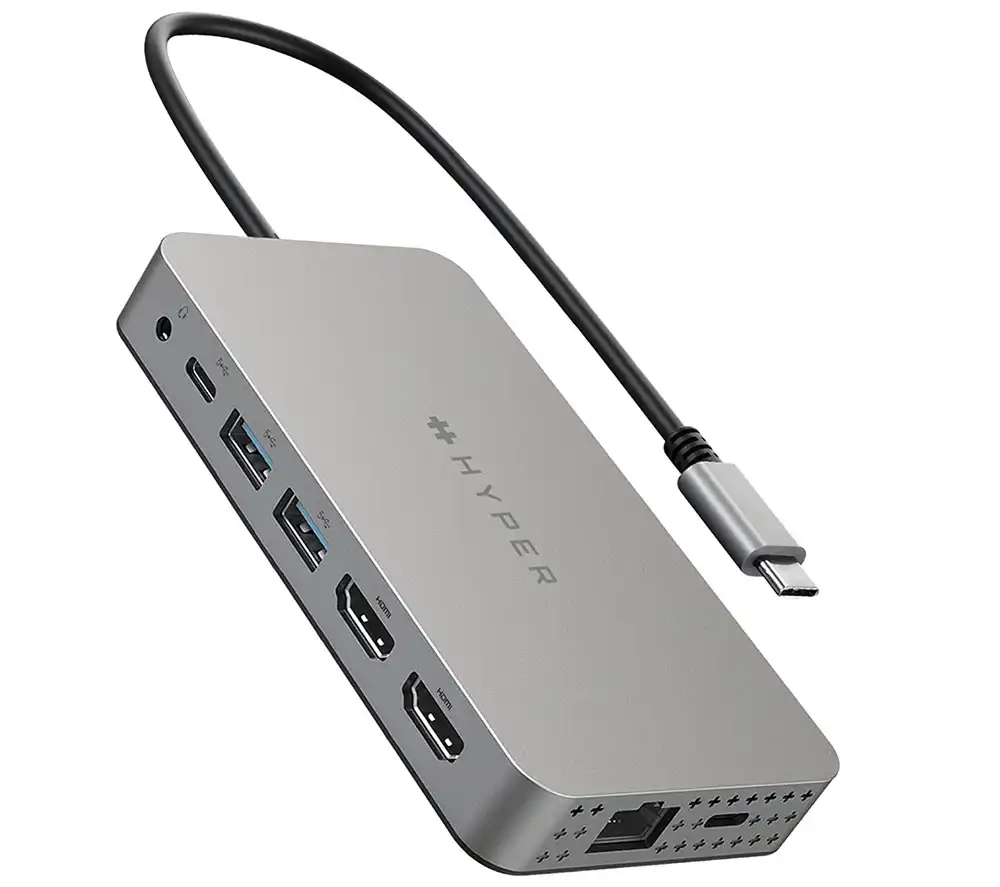 Концентратор Baseus 10-в-1 с разъемом USB-C: сквозная зарядка мощностью 100 Вт; 2 разъема HDMI (один с разрешением 4K при 120 Гц; другой HDMI с разрешением 4K при 60 Гц, но может отображать только дисплей Mac с разрешением 4K при 30 Гц); Gigabit Ethernet; 1 разъем USB-C со скоростью 10 Гбит/с; 3 разъема USB A (один со скоростью 10 Гбит/с и два со скоростью 480 Мбит/с), устройства для чтения карт SD и MicroSD через Amazon US.