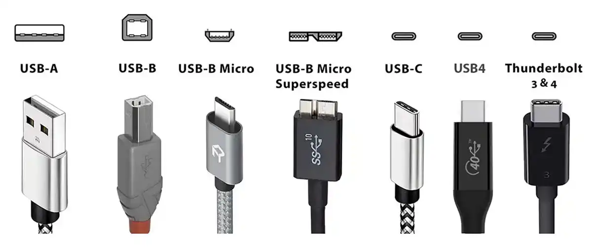 USB (универсальная последовательная шина) бывает самых разных форм, размеров и скоростей. USB-C — самый современный из них, он может передавать больше данных и энергии, чем более старый USB-A. У вас всё ещё могут быть кабели MicroUSB с их неудобными разъёмами или порты USB-B, которые можно найти на многих принтерах. Подробнее об этом читайте в нашей статье «Скорость, типы и функции USB».