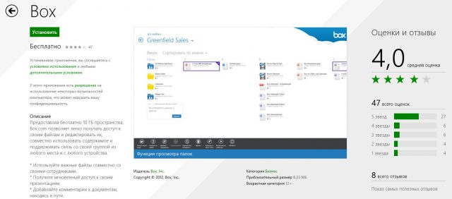 Специальное приложение Windows 8 позволяет обращаться к сервису Box через кнопку «Поиск» чудо-панели. Кнопка «Поделиться» упрощает процедуру передачи файлов. Кроме того, вы можете привязать папки Box к начальному экрану, где они превращаются в живые плитки, сигнализирующие о том, что коллеги изменили совместно используемые файлы.