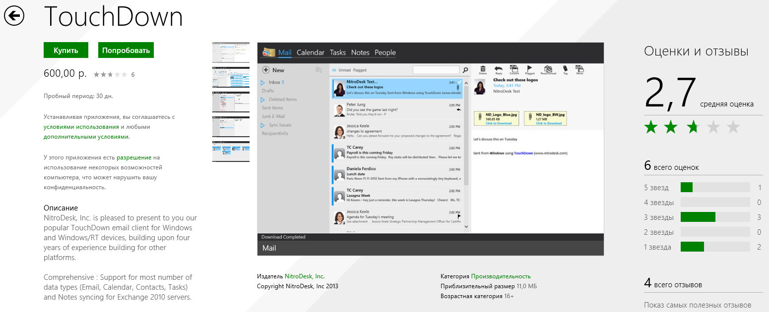 Приложение TouchDown, предлагаемое компанией NitroDesk за 600 руб., по своим функциональным возможностям, конечно, не может сравниться с Outlook, но синхронизировать электронную почту, события календаря, контактную информацию, заметки и задачи оно поможет без каких-либо затруднений. (А ведь приложение Windows 8 «Почта» ничего такого не делает!) Кроме того, TouchDown поддерживает расширенные функции Exchange: использование PIN-кодов, удаленное стирание информации и шифрование данных на устройстве.