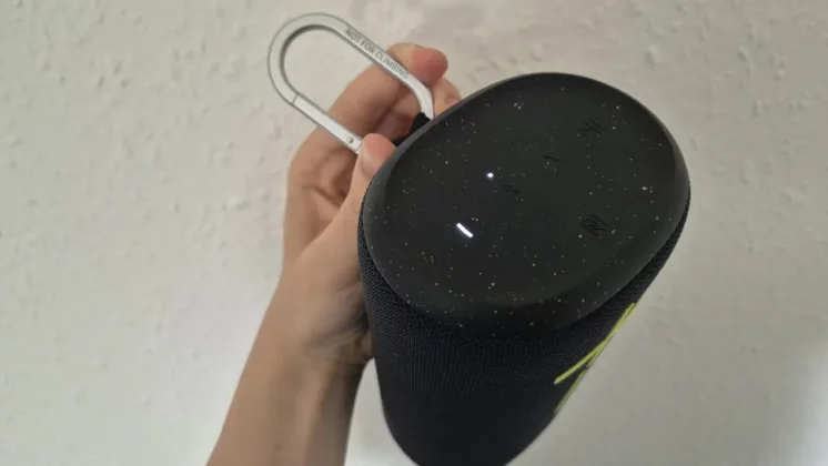 Дизайн: как и несколько других колонок в этом руководстве, Loewe We Hear Pro имеет цилиндрическую форму с портами на обоих концах и удобными сенсорными элементами управления сверху. На задней панели вы найдёте порт USB-C и разъём для кабеля AUX за водонепроницаемой крышкой. Колонка имеет степень водонепроницаемости IPX6, что означает, что она должна выдержать небольшой дождь, но не является полностью водонепроницаемой. Она доступна в чёрном, синем или неоново-жёлтом цветах. Во время тестирования нам понравился неоновый оттенок, и, поскольку он очень яркий, вы вряд ли его где-нибудь потеряете. При весе 2,2 кг это не самый портативный вариант в нашем обзоре, но к нему прилагается удобный ремешок для переноски.
