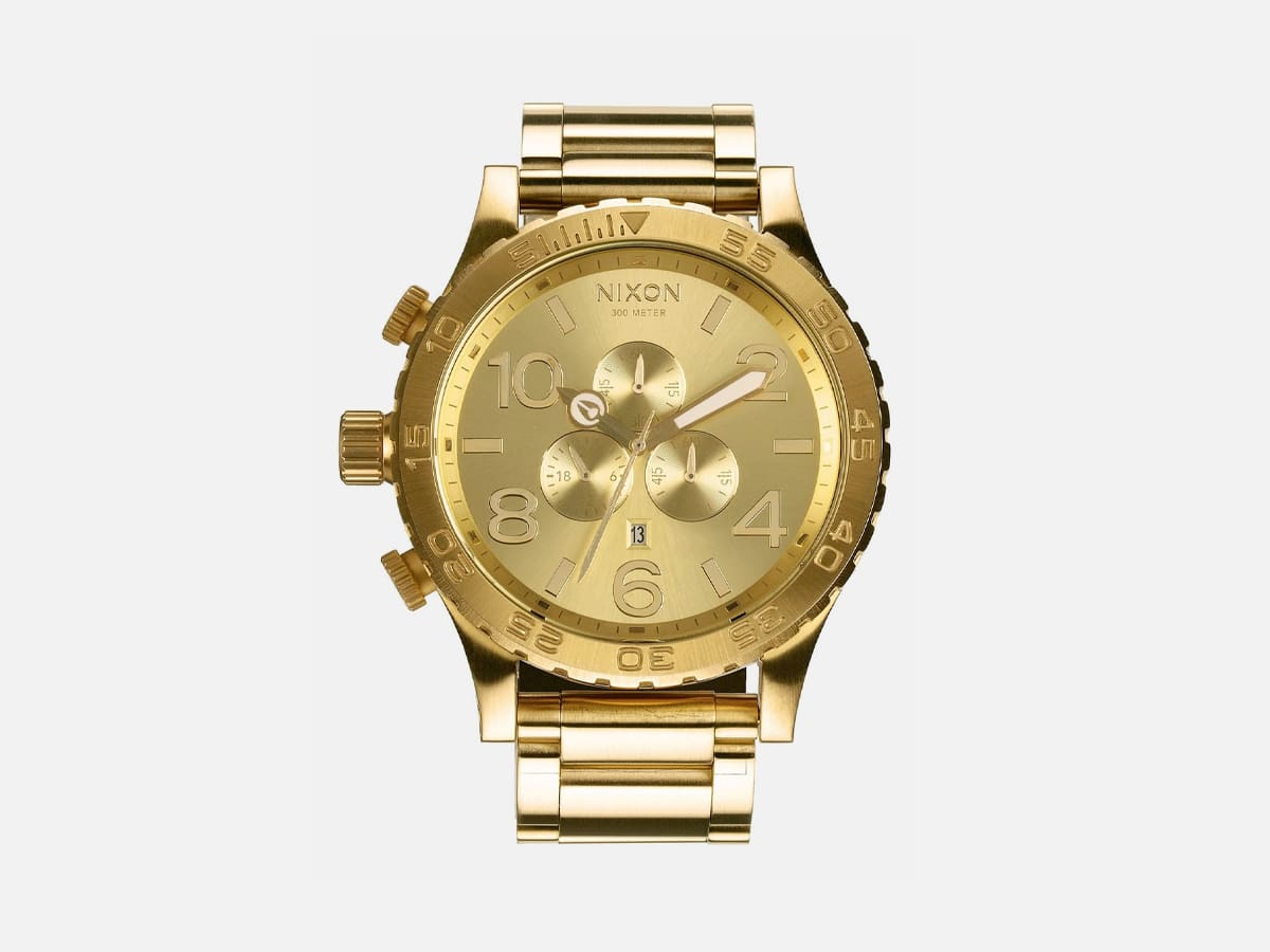 Таким образом, несмотря на основы часового дела, золотые часы Nixon Chronograph — это те часы, которые вы бы купили просто из-за их внешнего вида. Вы бы не пошли в магазин и не стали интересоваться их запасом хода или точностью хода, а скорее приняли бы решение о покупке, основываясь на том, как они выглядят на вашем запястье. И в этом нет ничего плохого. Это одни из лучших доступных по цене часов! Определённо одни из лучших золотых часов стоимостью менее 100 000 рублей.