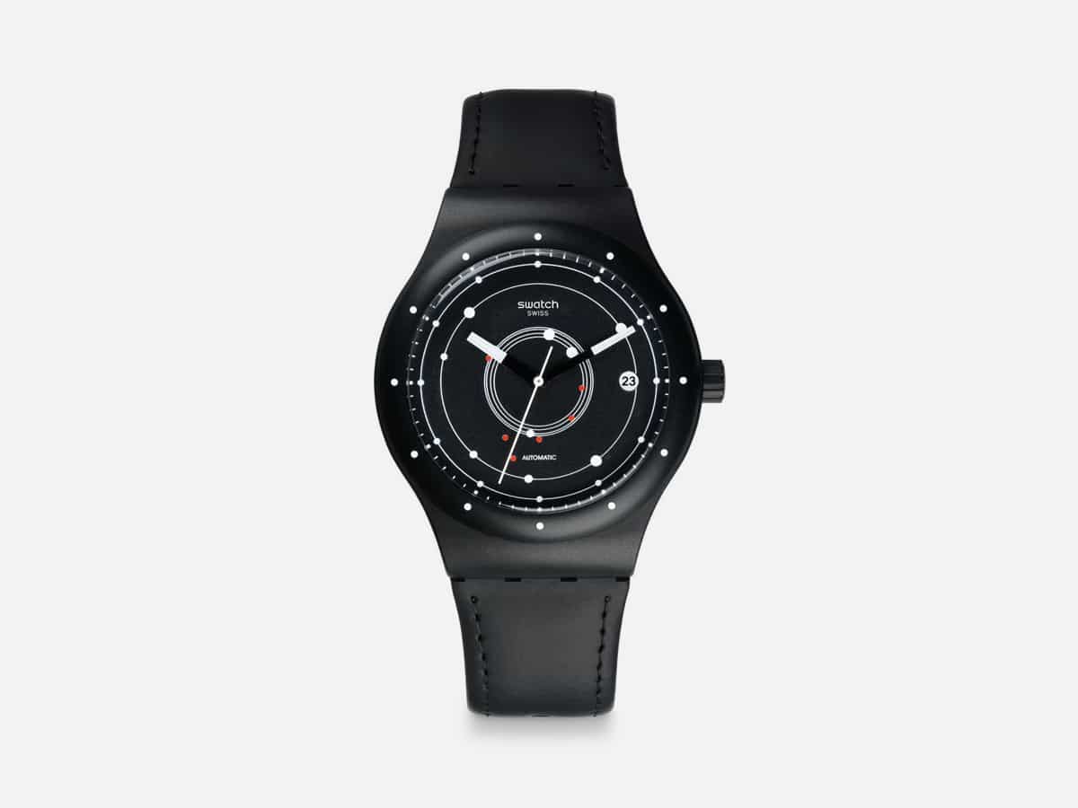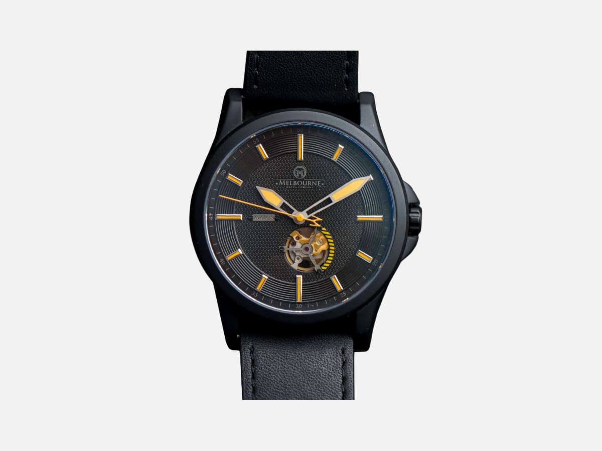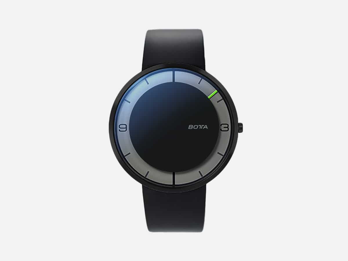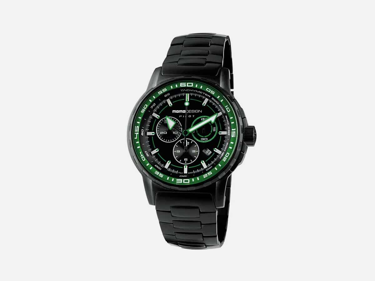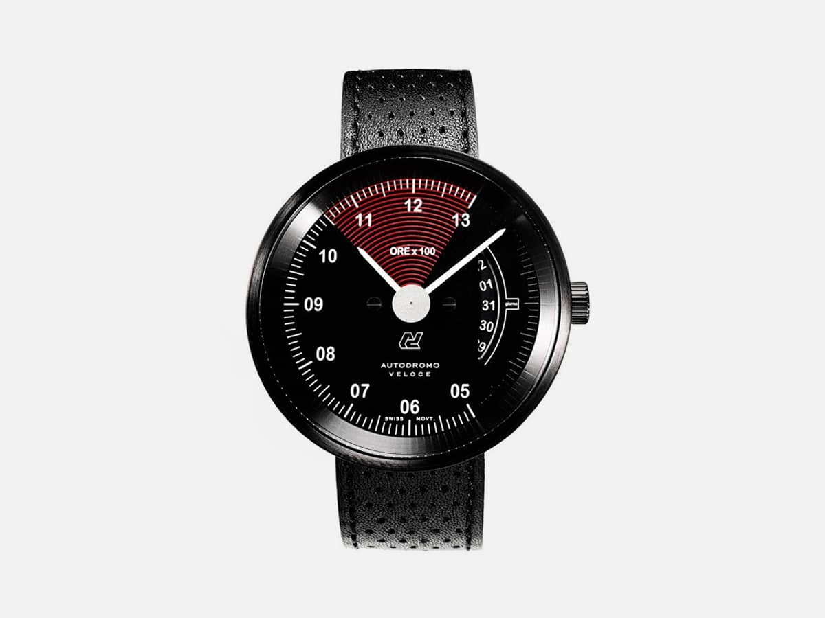 Veloce — это эффектные часы, дизайн которых напоминает приборную панель старого спортивного автомобиля. Красный цвет на циферблате между 11 и 1 часами разбавляет темноту, а чёрный корпус из полированного металла выглядит невероятно. Тёмные и зловещие — идеальные часы для вечерней прогулки по городу и одни из лучших доступных часов для тех, кто любит что-то необычное.
