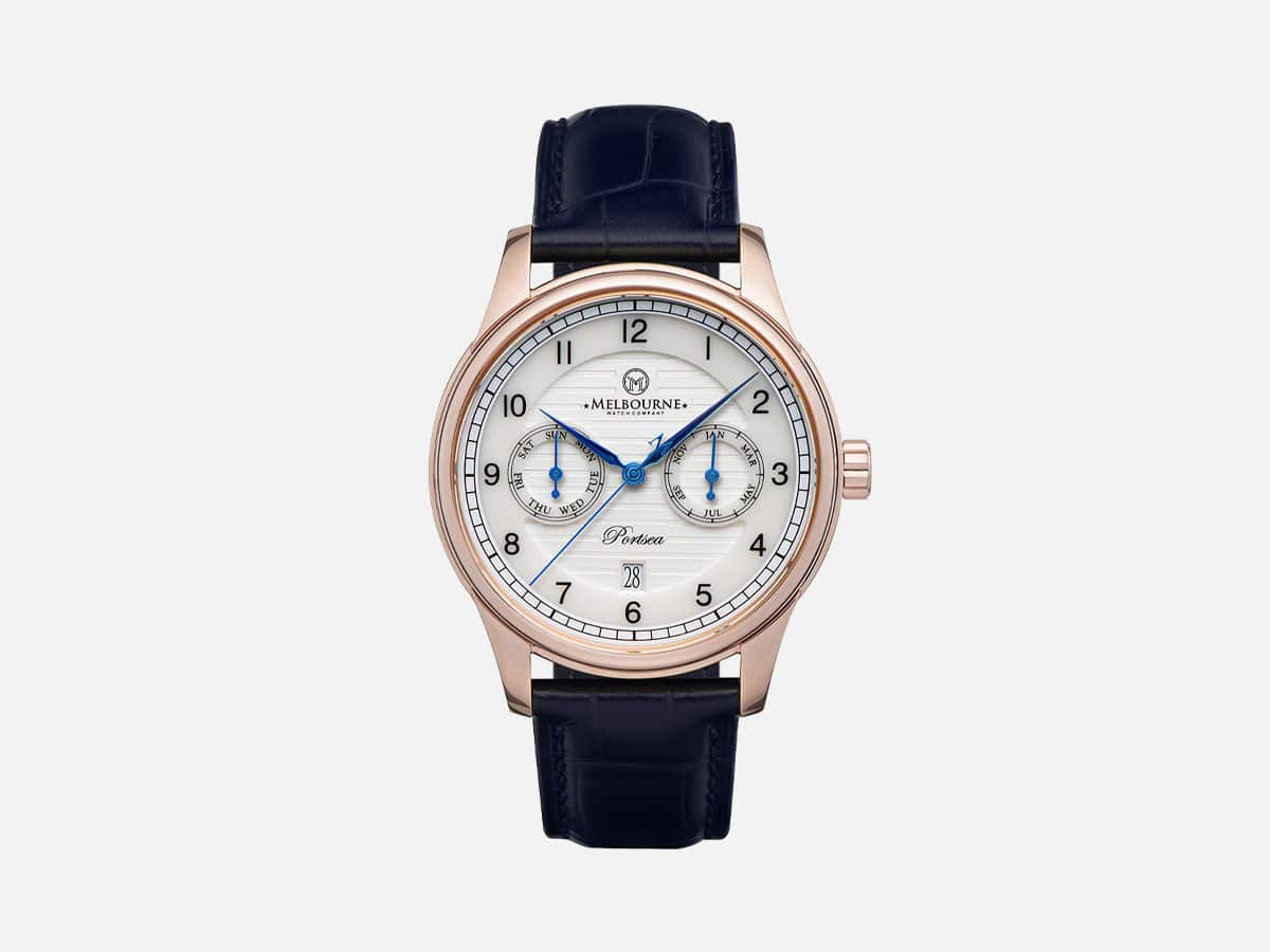 Элегантный дизайн с минимальным количеством деталей на циферблате и встроенным ремешком действительно подчёркивает идею C31s. Это очень простые и лаконичные часы с рельефным матово-белым циферблатом и корпусом из нержавеющей стали с покрытием из розового золота, которые выглядят очень красиво, а тонкий безель подчёркивает чистоту циферблата. Это одни из наших любимых золотых часов стоимостью менее 100 000 рублей.