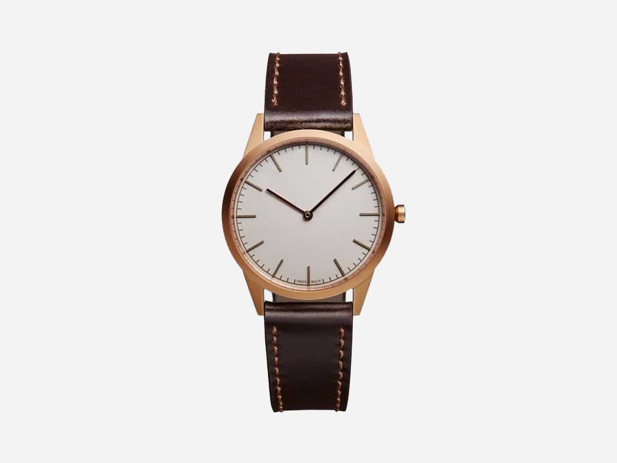 Один из самых красивых часов, представленных в этой статье, и, безусловно, одни из самых доступных часов стоимостью менее 1000 рублей — это хронограф Uniform Wares M42, отличный минималистичный экземпляр, который не слишком большой и не разорит вас. Нанесённые часовые метки и утопленные регистры на циферблате выглядят замечательно, и хотя окошко для даты немного не на своём месте, выглядит оно неплохо. Простое по дизайну, но гениальное по исполнению.