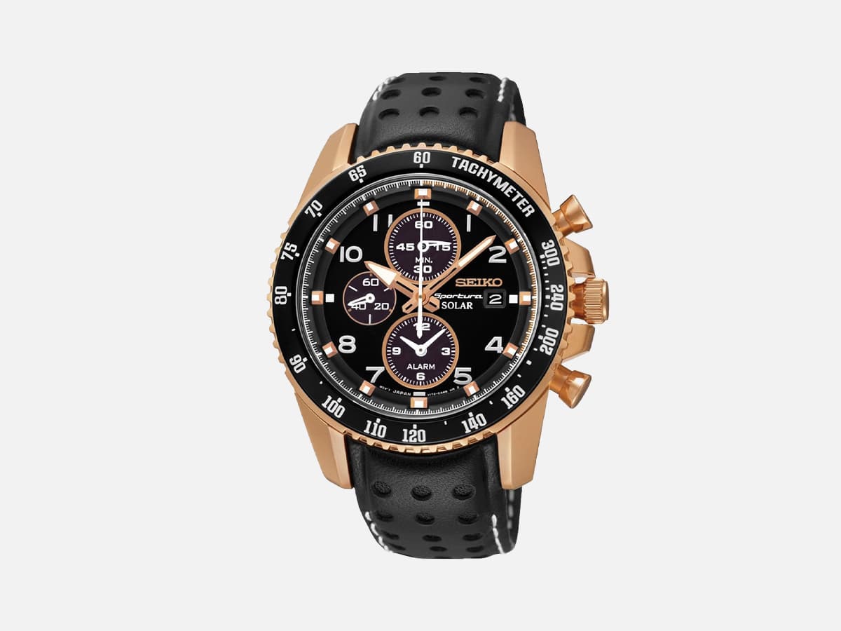 Среди лучших доступных по цене часов и лучших часов в целом очень приятное сочетание цветов, которое, как мы знаем, работает, — золото и чёрный. Компания Seiko использовала его для создания модели, которую можно носить практически с любым нарядом. Бренд знает толк в создании лучших доступных по цене часов, и эта модель, естественно, не исключение. Циферблат красивый и насыщенный, но при этом хорошо продуманный и очень читаемый. Открытые кнопки, заводная головка и её защита, а также удлинённые ушки делают в целом типичный корпус немного интереснее. Безель выглядит фантастически, и хотя в нём используется кварцевый механизм, он всё равно выглядит и звучит очень привлекательно.