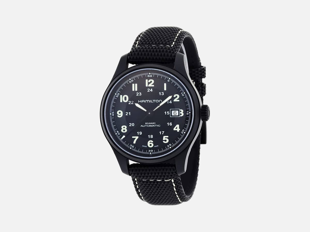 Красивые винтажные часы в стиле милитари Khaki Field, похожие на Seiko 5, оснащены внутренним кольцом, показывающим время в 24-часовом формате, и внешним кольцом, показывающим время в 12-часовом формате. У них есть окошко с датой, что всегда полезно, а стрелки и цифры часов выполнены из люминесцентных материалов. Корпус глубокого черного цвета из титана выглядит элегантно и универсально.