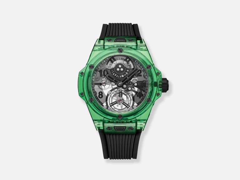 Неделя часов LVMH не была бы неделей часов LVMH, если бы Hublot не представил что-то безумное, и в этом году это были часы Big Bang Tourbillon Automatic Green Saxem. Эти 44-миллиметровые часы с зелёным сапфировым стеклом не только трудно поддаются описанию, но и примечательны сами по себе. Изготовленные из SAXEM — материала, родственного сапфиру, который, по утверждению Hublot, обладает более высокой светоотдачей и цветовой гаммой, — часы Big Bang Tourbillon Automatic имеют прозрачный корпус, механизм с автоподзаводом и выпущены ограниченным тиражом в 18 экземпляров.