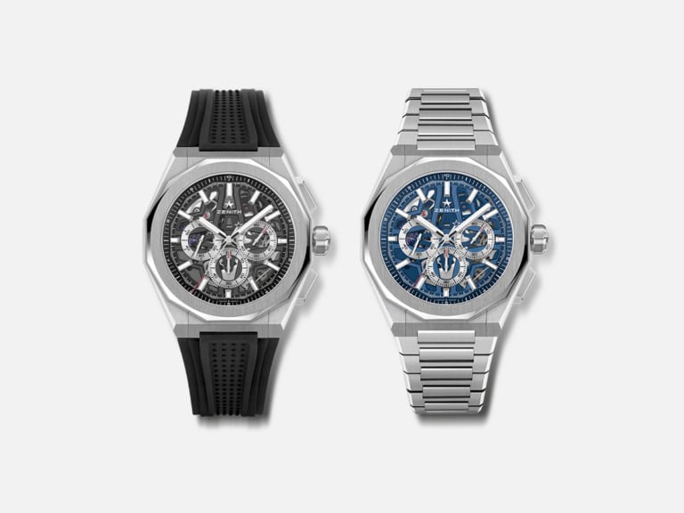 Две модели скелетонизированных часов диаметром 42 мм изготовлены из нержавеющей стали и сохраняют культовый восьмиугольный корпус, характерный для коллекции с начала 1960-х годов. На этот раз Zenith дополнил их 12-гранным безелем с динамичными кнопками, что в целом придаёт часам более современный вид. Кроме того, чередование матовых и полированных поверхностей — приятный штрих, который подчёркивает традиционно угловатый дизайн линейки Defy.
