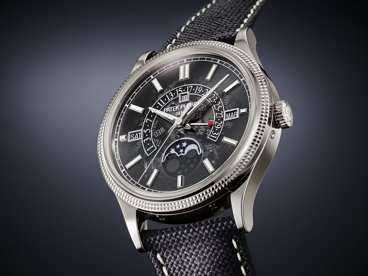 Модель Patek Philippe 6159G с вечным календарем и ретроградной датой сама по себе является настоящим украшением. Она оснащена циферблатом из дымчатого сапфира (который был зарезервирован для модели 5316P), безелем из белого золота и корпусом из белого золота. Модель 6159G с вечным календарем и ретроградной датой не только выглядит эффектно, но и работает. В часах 6159G используется механизм 26-330 S QR, который сам по себе является шедевром, с вечным календарем, ретроградной датой и индикатором фаз Луны. Великолепные часы.