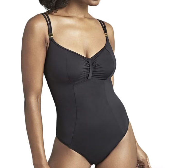 Он имеет скрытые бретельки, встроенные двухслойные чашечки и застёжку-крючок на спине для дополнительной поддержки груди. Бретельки украшены золотой фурнитурой, на бюсте есть шикарная рюшевая деталь, и нам нравятся швы-стрелки, которые идут по всему купальнику, создавая эффект песочных часов.