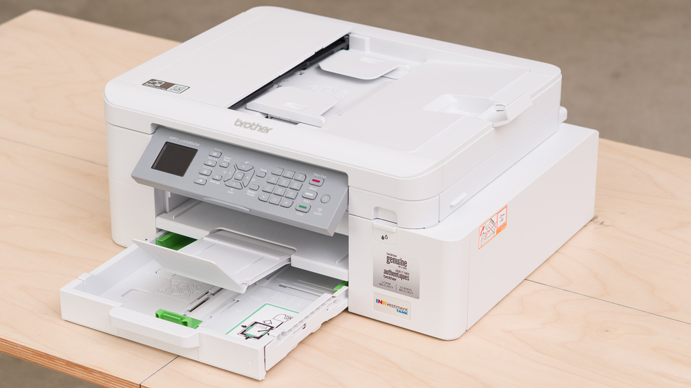 Если вам нужен более скромный принтер для домашнего использования, но при этом у вас умеренная нагрузка на печать и вам нужен широкий спектр функций, то в среднем ценовом сегменте вы найдёте лучшие варианты. Мы рекомендуем Brother MFC-J4335DW — струйную модель. Она более компактная и доступная по цене, чем лазерные модели, которые мы рекомендовали выше. Вы по-прежнему получаете множество функций, таких как сканер с автоподачей, широкие возможности подключения и высокую скорость печати. Он позволяет получать высококачественные документы, и хотя у него не самая высокая точность цветопередачи и не самая широкая цветовая гамма, напечатанные фотографии всё равно выглядят достойно для повседневного или домашнего использования.