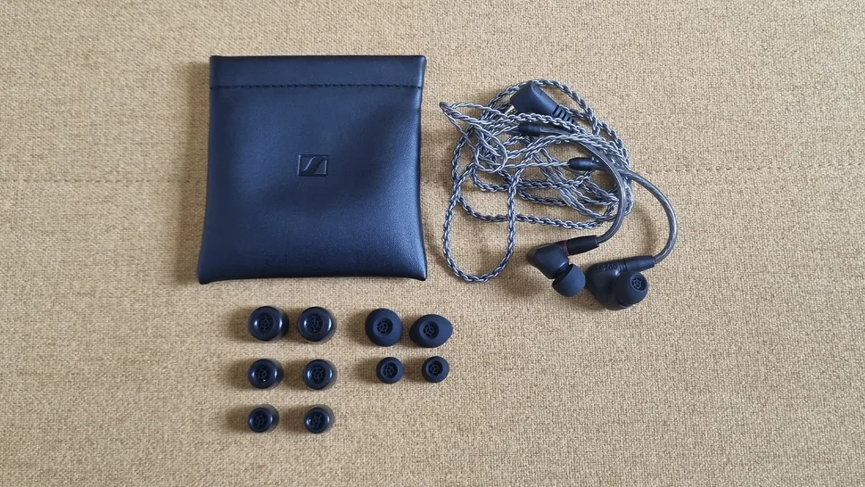 Плетёный кабель длиной 1,2 м прочный и, благодаря разъёмам MMCX на конце наушников, его можно заменить на другой. Концы длиной с палец, расположенные ближе к наушникам, закрыты трубкой, которая оборачивается вокруг ушей для более надёжной фиксации, а сами относительно невзрачные чёрные корпуса компактны. Три размера силиконовых насадок и насадок из пены с эффектом памяти, а также чехол из искусственной кожи (не такой «аудиофильский», но приемлемый по цене) дополняют продуманный дизайн, который можно было бы ожидать от компании, работающей в этой сфере так же долго, как Sennheiser.