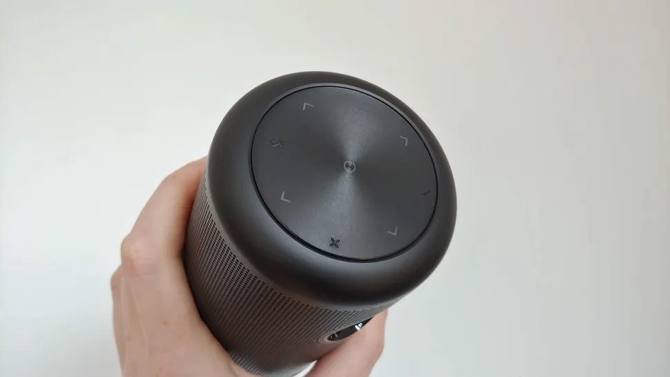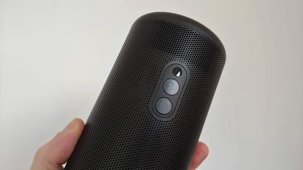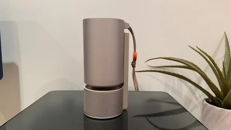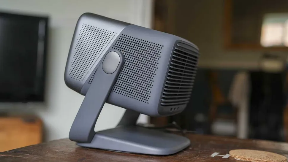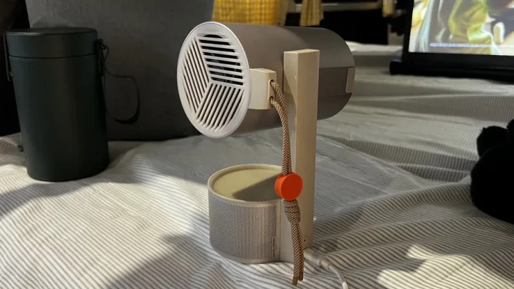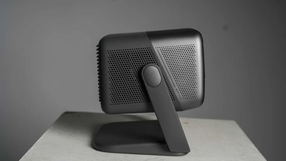 Дизайн лаконичный, напоминает Hi-Fi-колонку с поворотной подставкой, которая также служит ручкой для дополнительной мобильности. В нём нет встроенного аккумулятора — вам придётся использовать сетевой кабель, но это делает устройство лёгким.