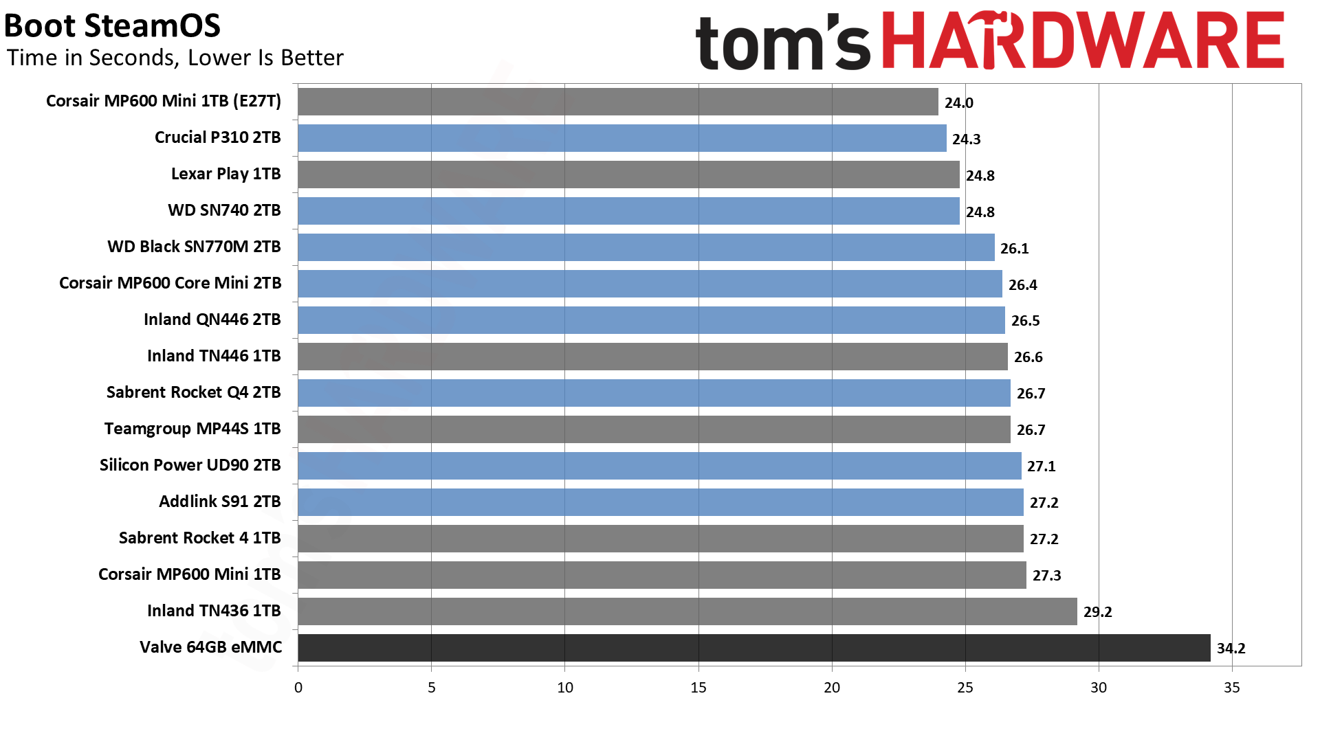 Наше тестирование проводилось в течение многих месяцев, что также означает, что некоторые из более свежих накопителей были протестированы с более новыми обновлениями SteamOS. Мы не можем исключить некоторые оптимизации производительности с этой стороны, поэтому, например, Lexar Play 1TB, WD SN740 2TB, Corsair MP600 Mini E27T и Crucial P310 являются последними дополнениями к нашему тестированию и, как правило, загружают SteamOS быстрее, чем ранее протестированные накопители. В то же время Crucial P310 теперь имеет поддержку Proton 3.0, что, похоже, увеличило время запуска.