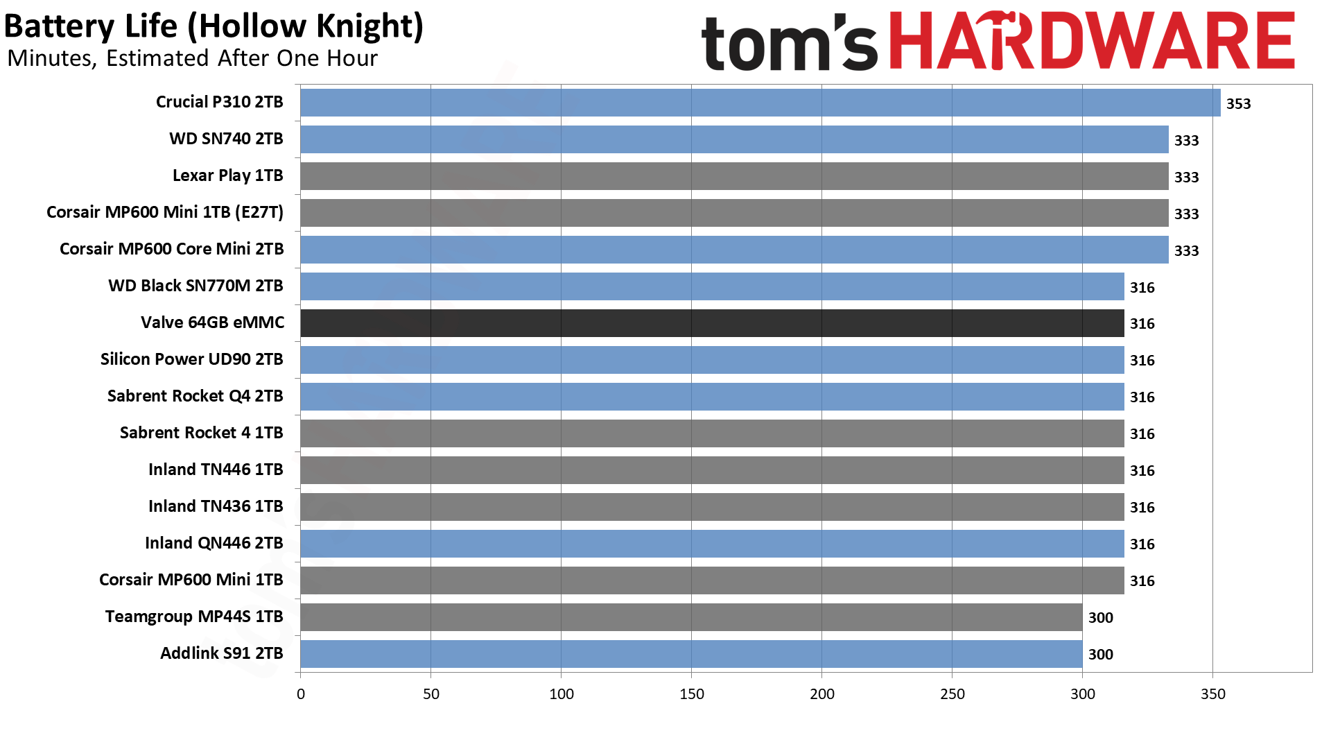 Время автономной работы в конечном итоге оказывается в основном неважным фактором. У всех SSD оставалось от 80% до 83% заряда батареи после одного часа тестирования. В этом показании есть погрешность не менее 1%, и опять же, обновления SteamOS могут влиять на некоторые последние результаты. На данный момент у нас есть один накопитель, неслучайно самый последний из протестированных нами, который проработал 353 минуты. Остальные SSD сгруппированы на отметках 333, 316 или 300 минут.