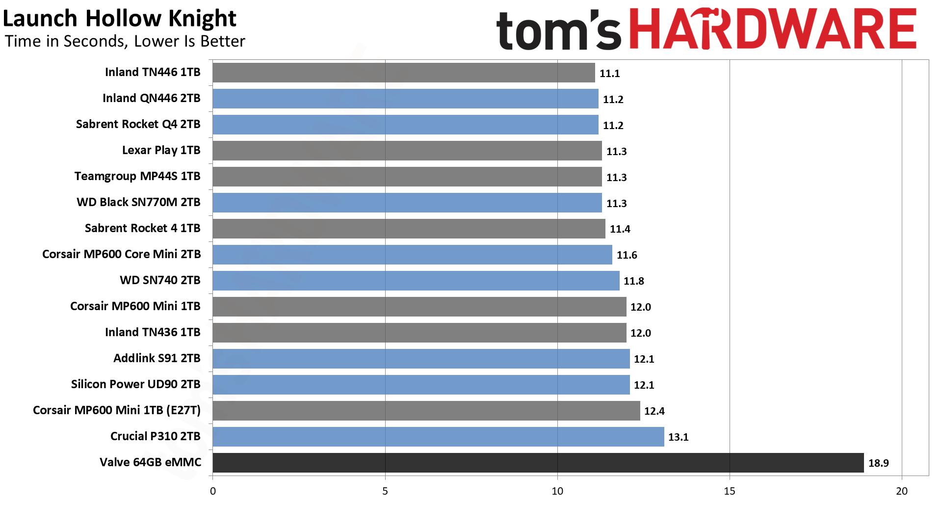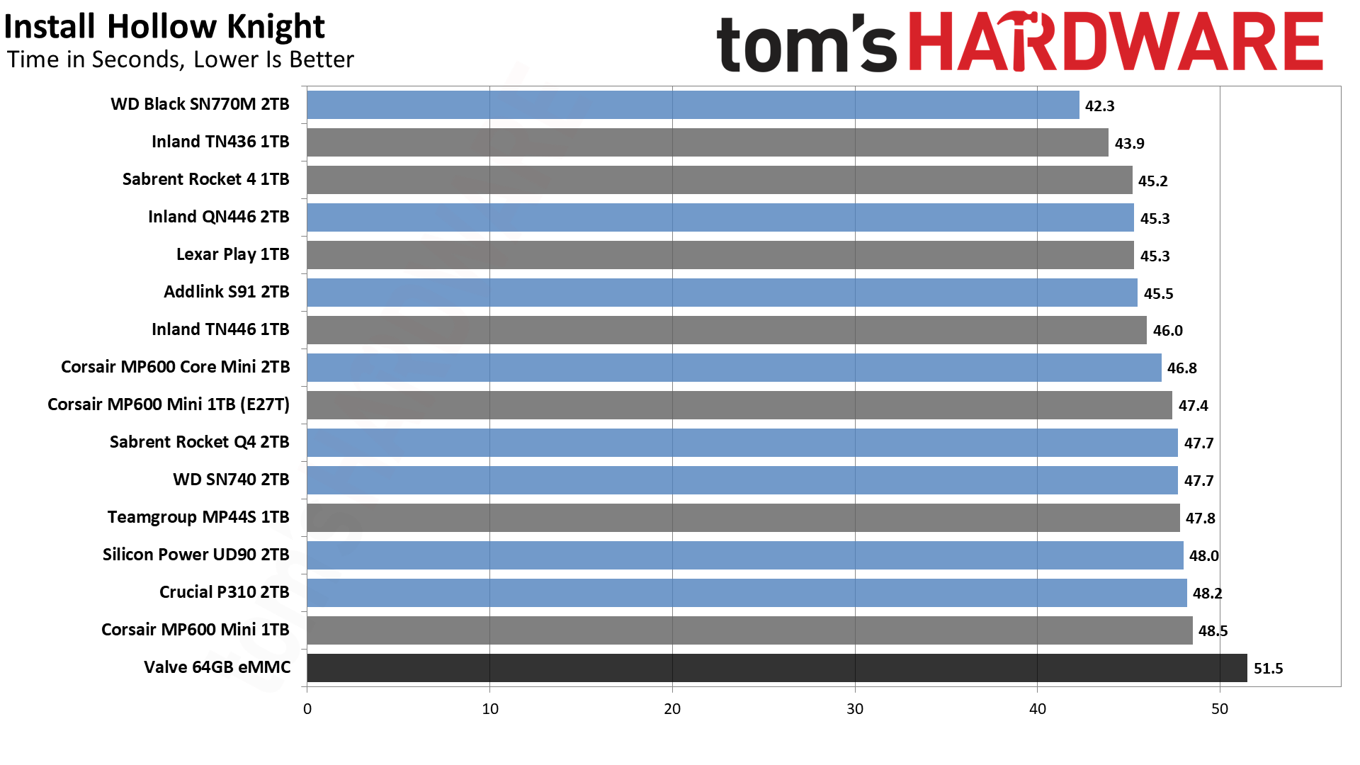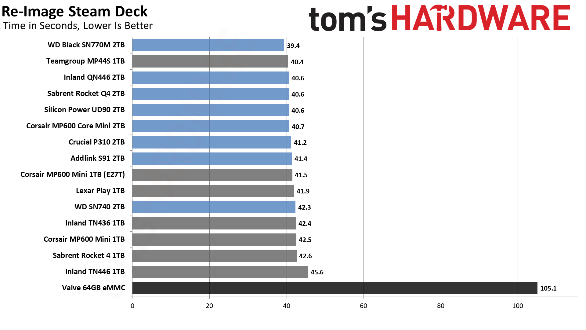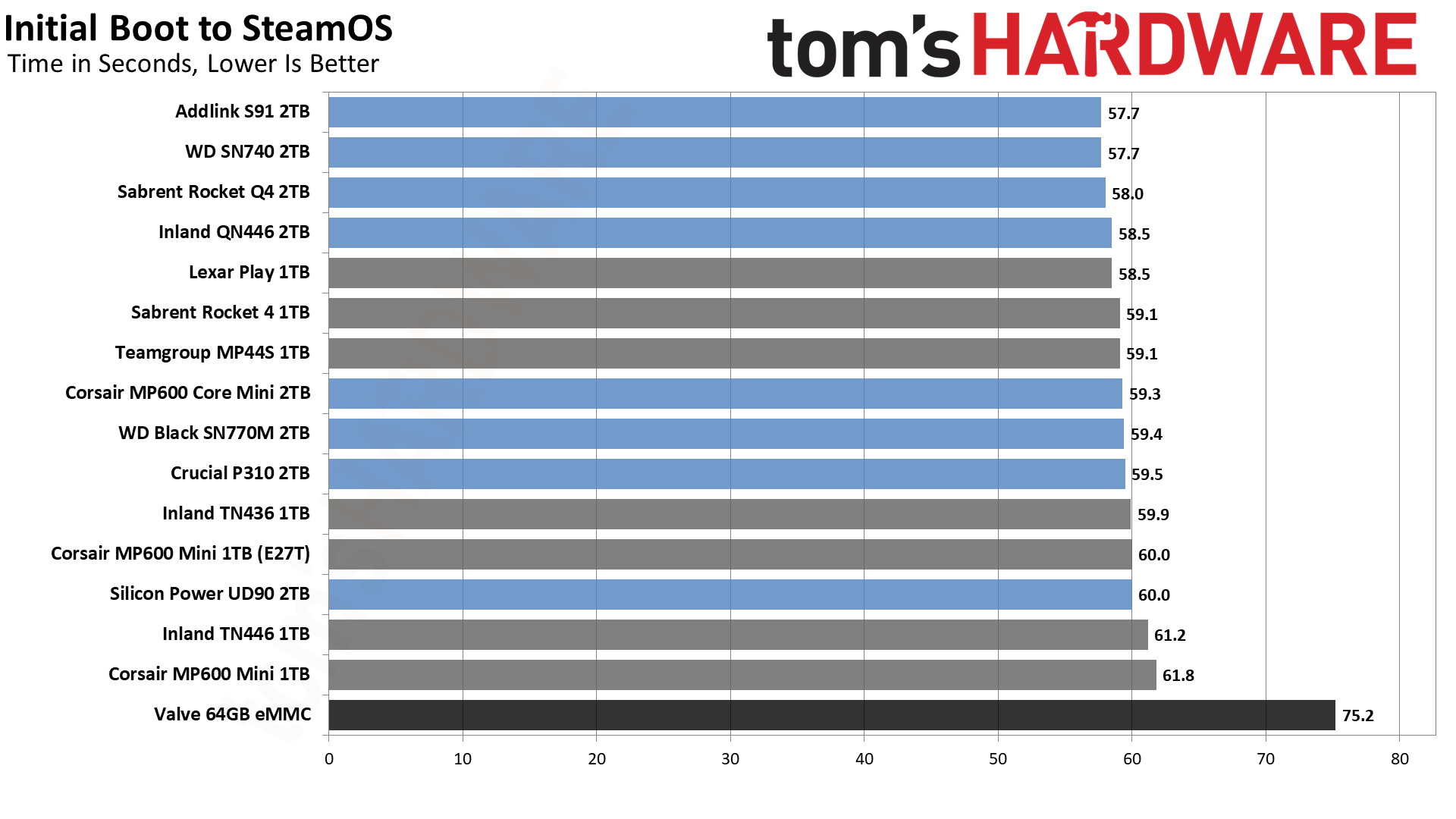 За исключением 64-гигабайтного накопителя eMMC, результаты производительности в основном настолько близки, что немногие люди заметят серьезную разницу в производительности при использовании Steam Deck.
