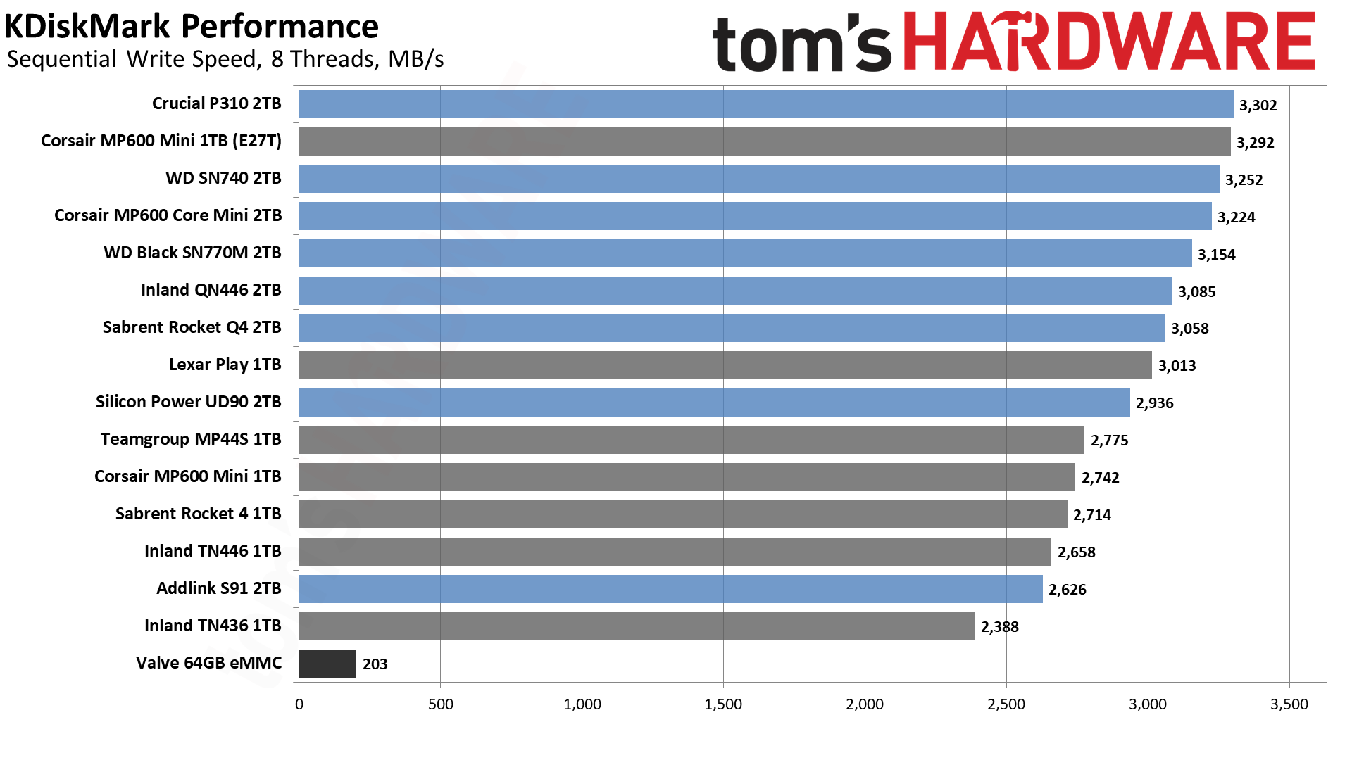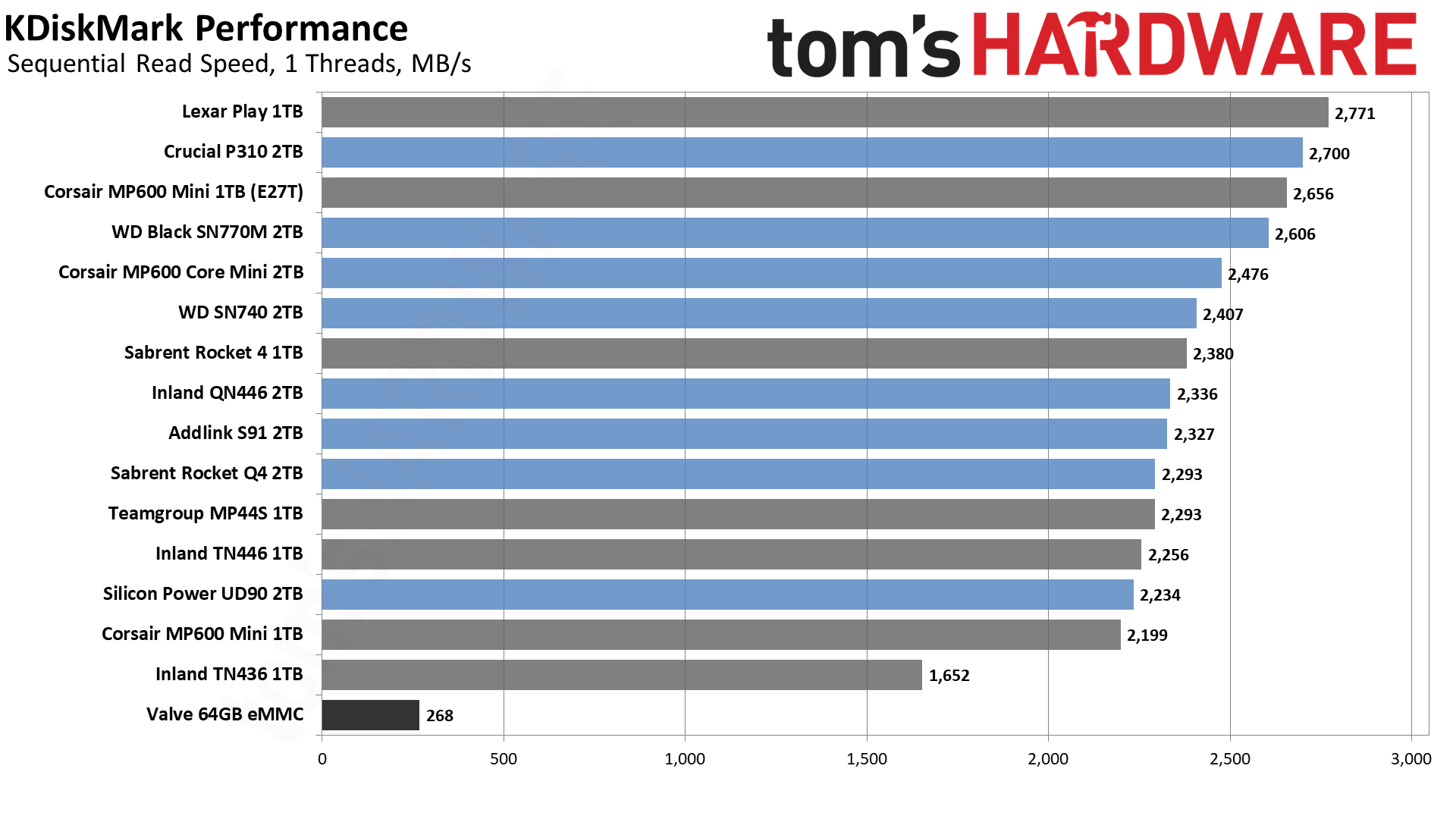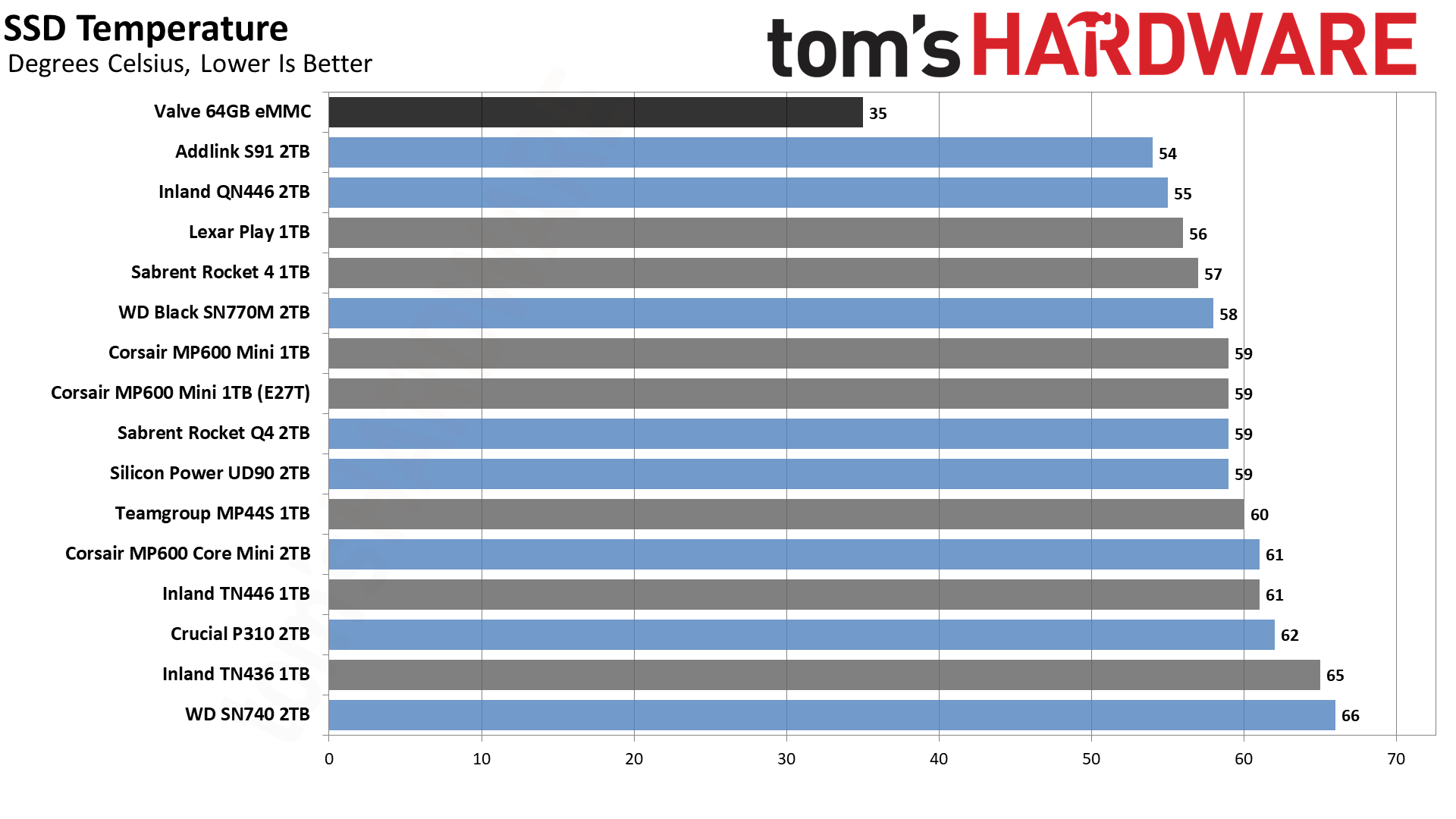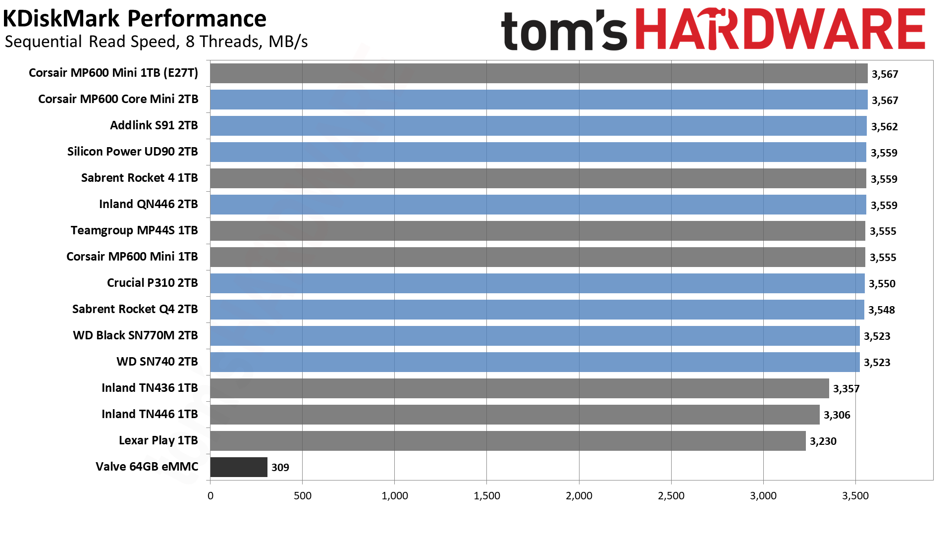 | Valve 64GB eMMC | 43.1 | 316 | 35 | PCIe 2.0 x2, N/A, TLC |