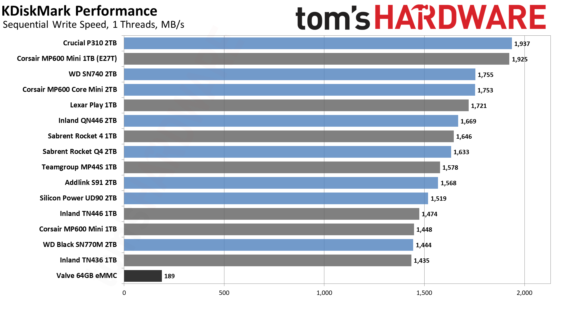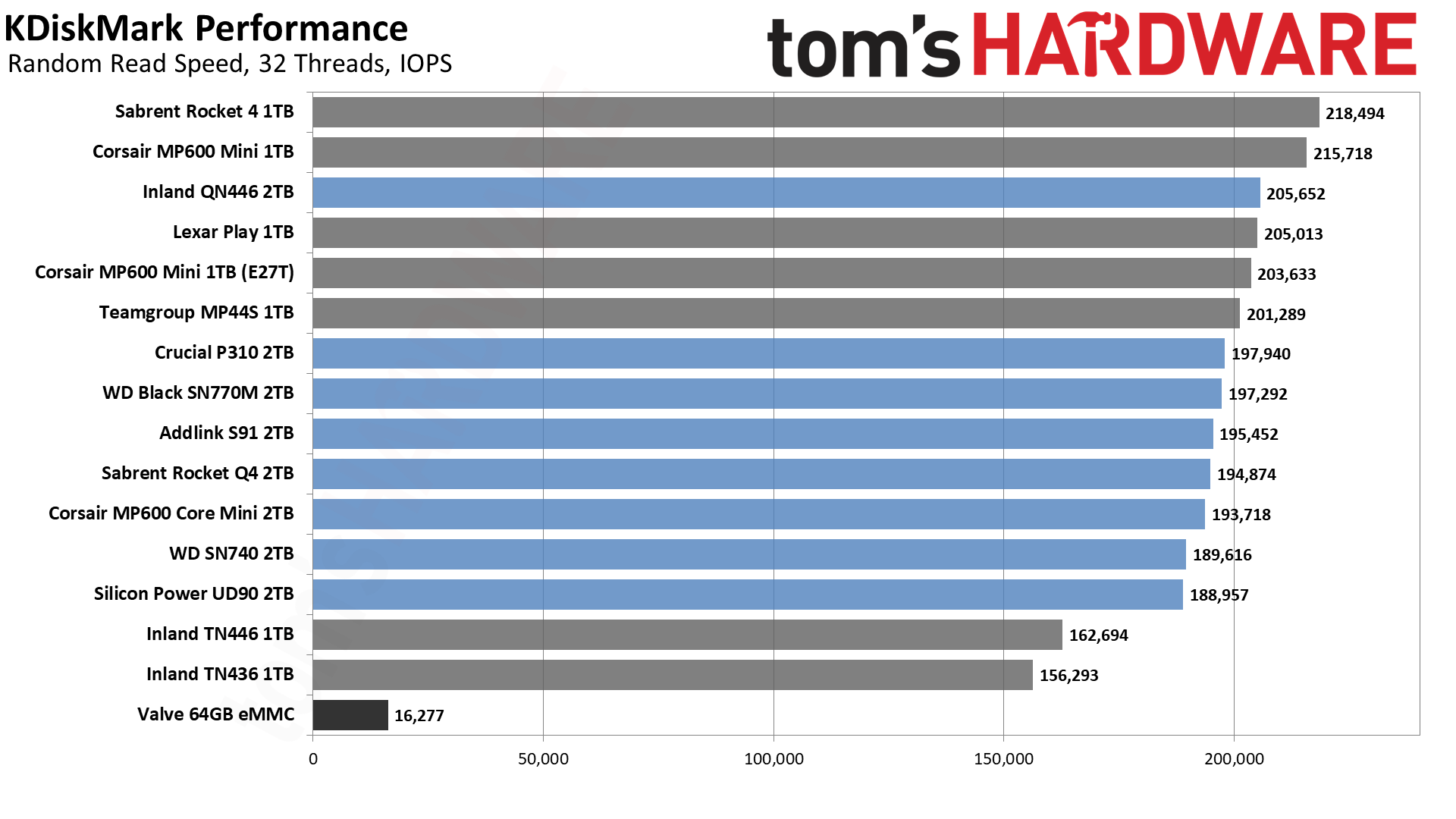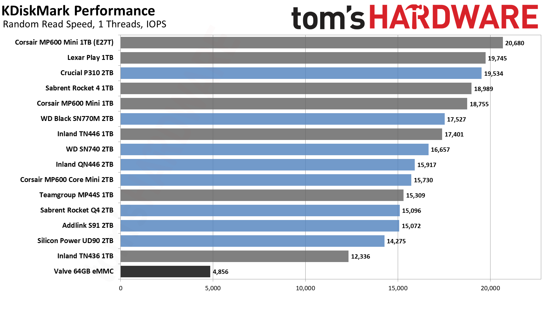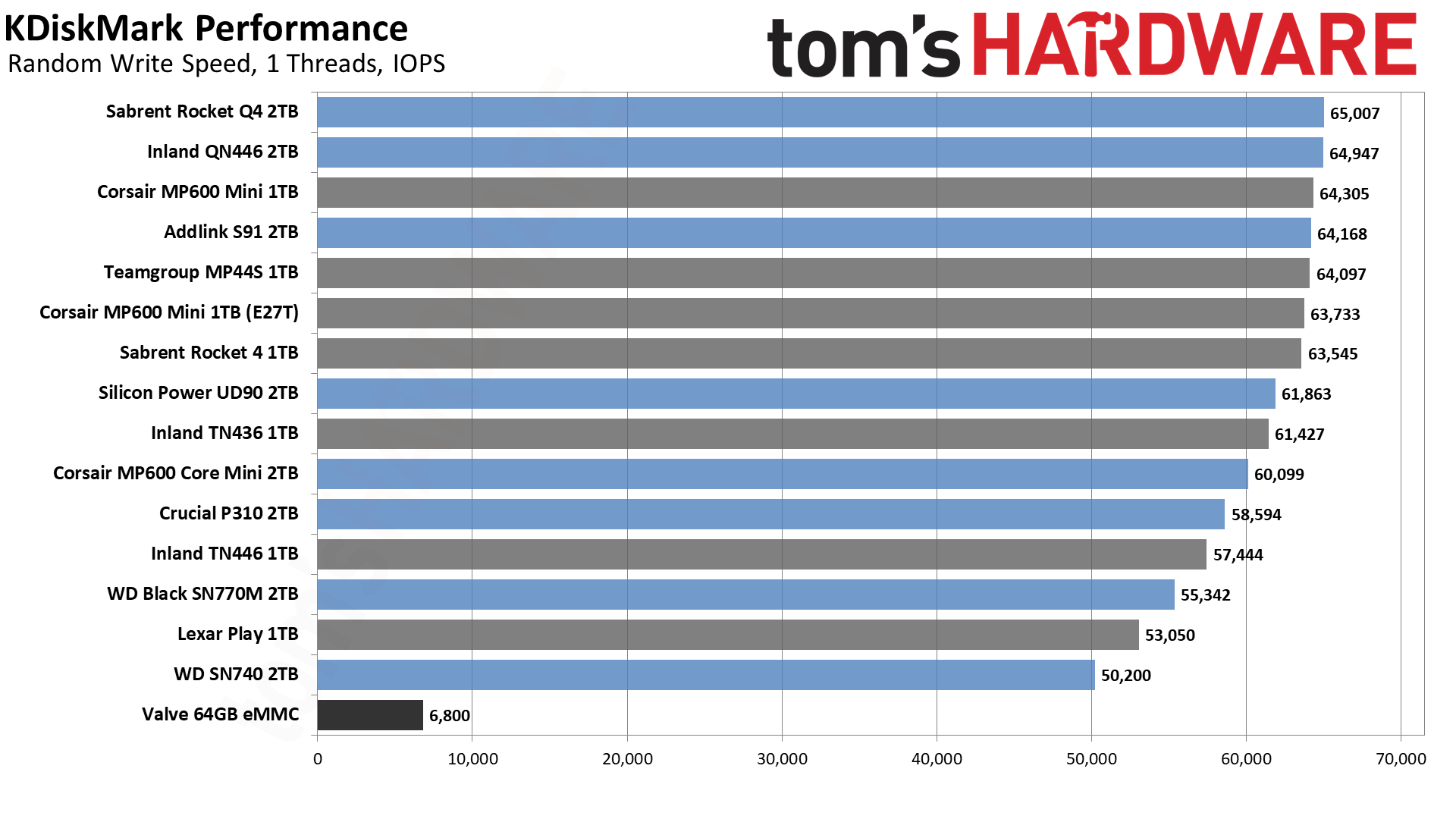 Результаты KDiskMark показывают гораздо большее расхождение между накопителями, хотя опять же, в практическом использовании — то есть в играх на Steam Deck — большинство накопителей работают достаточно хорошо, чтобы вы вряд ли заметили разницу. Единственным исключением является 64-гигабайтный накопитель eMMC, который постоянно находится в нижней части наших диаграмм. Это не слишком удивительно, поскольку он ограничен интерфейсом x2 PCIe 2.0, который достигает максимума в 500 МБ/с.